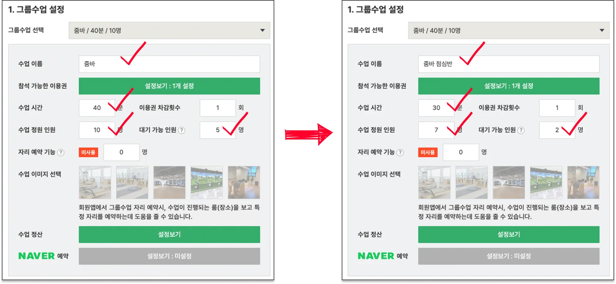 수업 이름과 수업 시간, 수업 인원을 수정했어요.