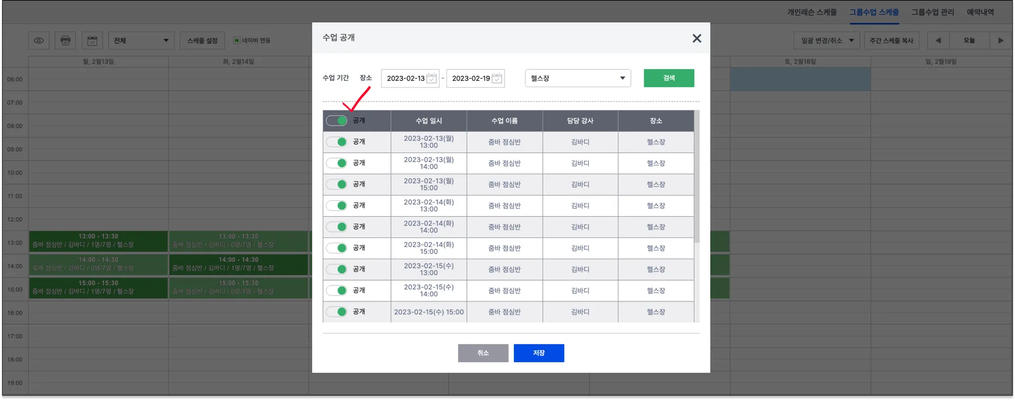 선택한 기간의 스케줄의 수업 공개/미공개를 일괄로 변경할 수 있어요.