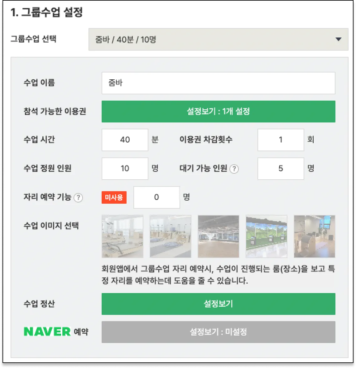예) 필라테스 1:6 레슨 / 스피닝 30분 수업 / 4:1 그룹레슨