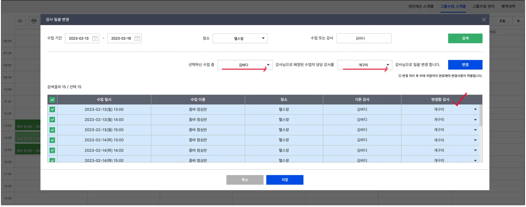 스케줄 별로 강사를 일괄 변경할 수 있어요!
