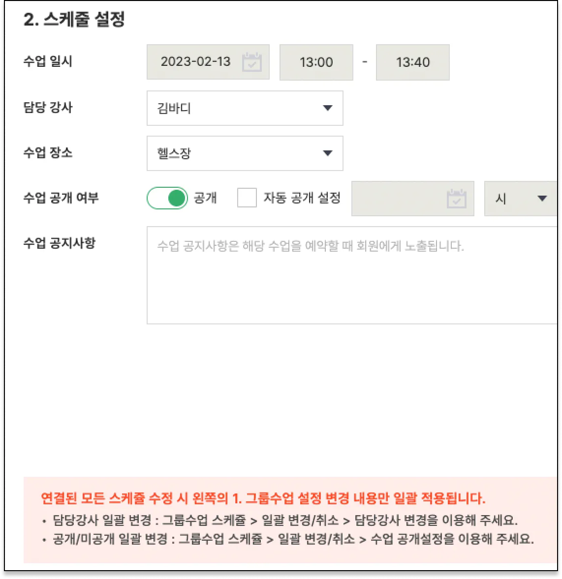 담당 강사, 수업 공개 여부 등 ‘스케줄 설정’의 정보는 하나의 스케줄만 변경돼요. 연결된 모든 스케줄 수정을 눌러도 해당 스케줄만 변경되니 유의해주세요!