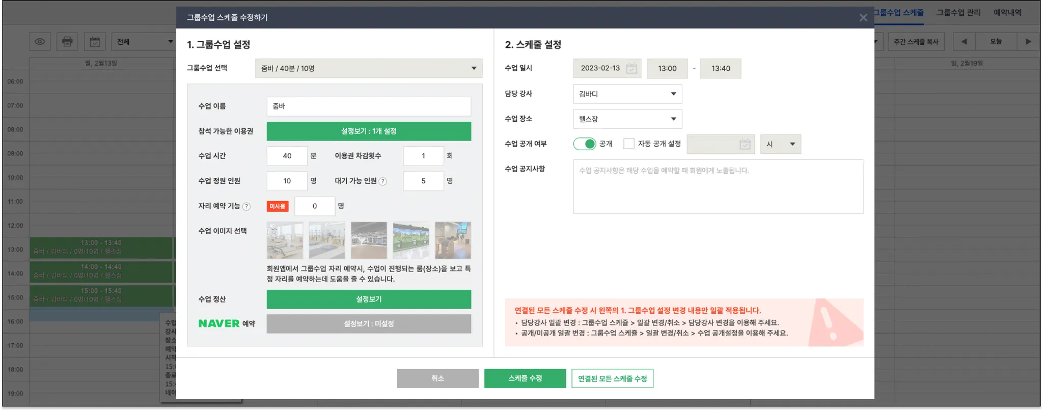 연결된 모든 스케줄 수정 기능은 수업 이름, 참석 가능한 이용권, 수업 시간 등 ‘그룹수업 설정’의 정보만 일괄 변경할 수 있어요.