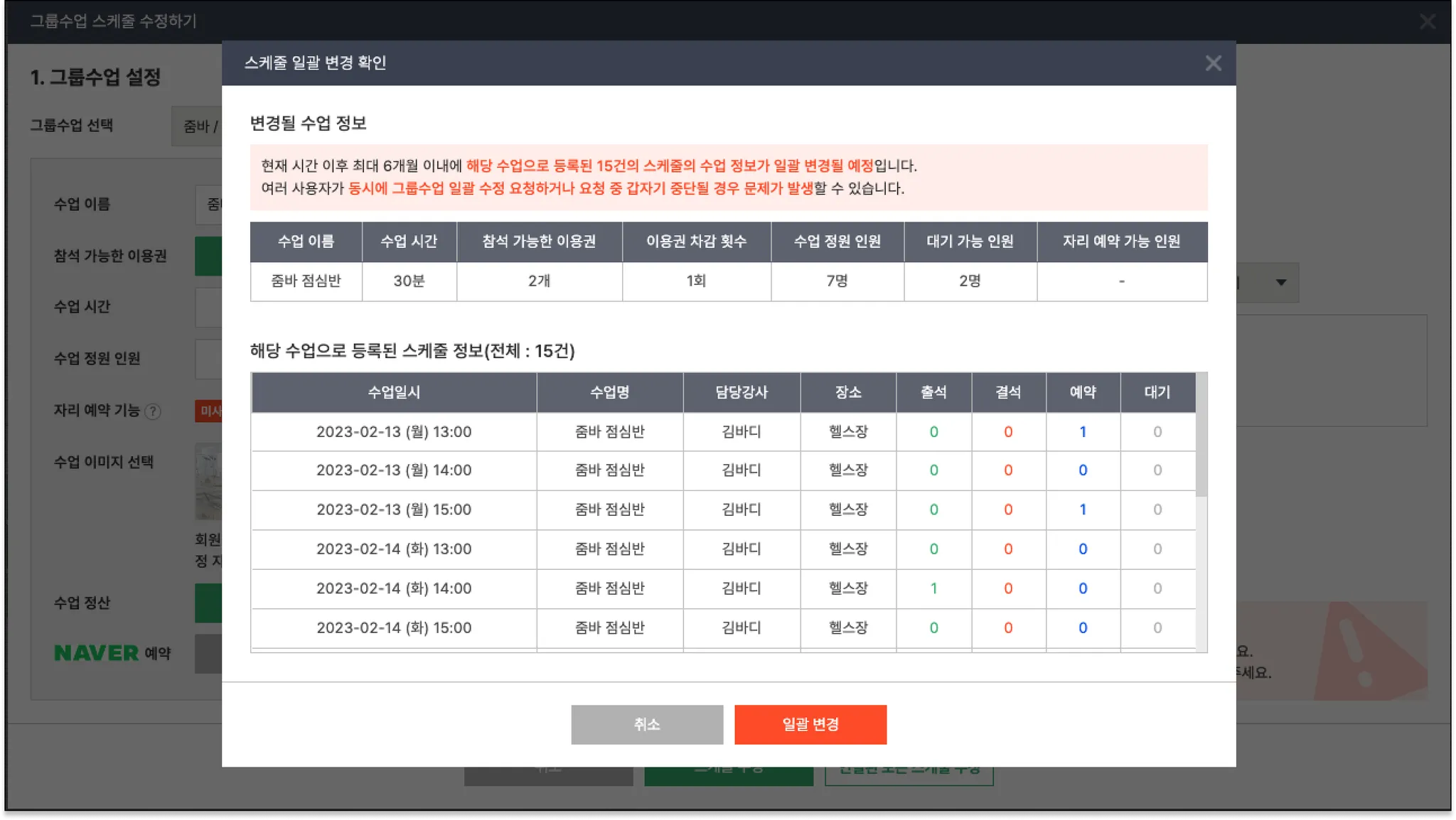 수업 정보나 스케줄 정보를 변경 시 동일한 수업으로 등록된 미래 6개월간의 수업 스케줄을 동시에 변경하는 기능이에요.