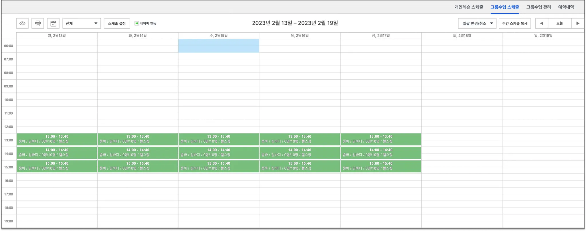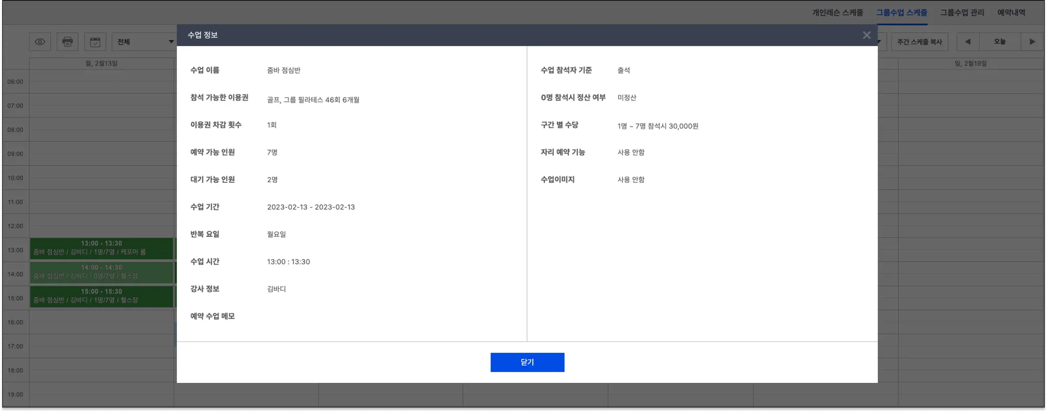 2월 13일부터 17일까지, 김바디 강사의 40분 줌바 수업이 있어요. 이 수업의 정보를 변경하고, 연결된 모든 스케줄을 수정해볼게요.