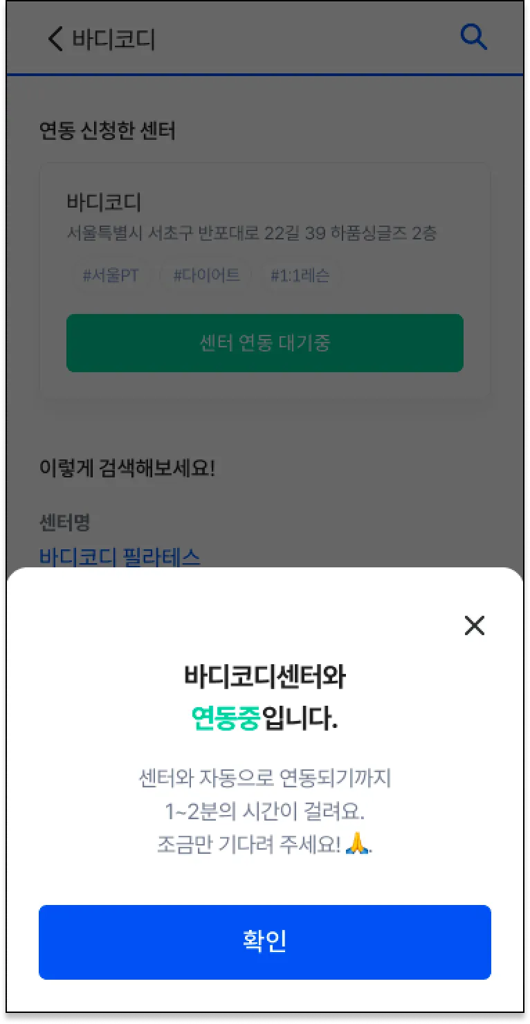 바디코디 회원앱에서 센터 연동을 신청하면 자동으로 연동을 진행해요.