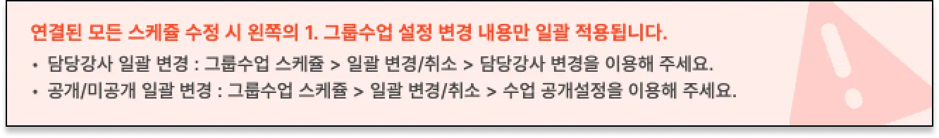 연결된 모든 스케줄 수정은 ‘그룹수업 설정’의 설정 내용만 일괄 적용돼요.