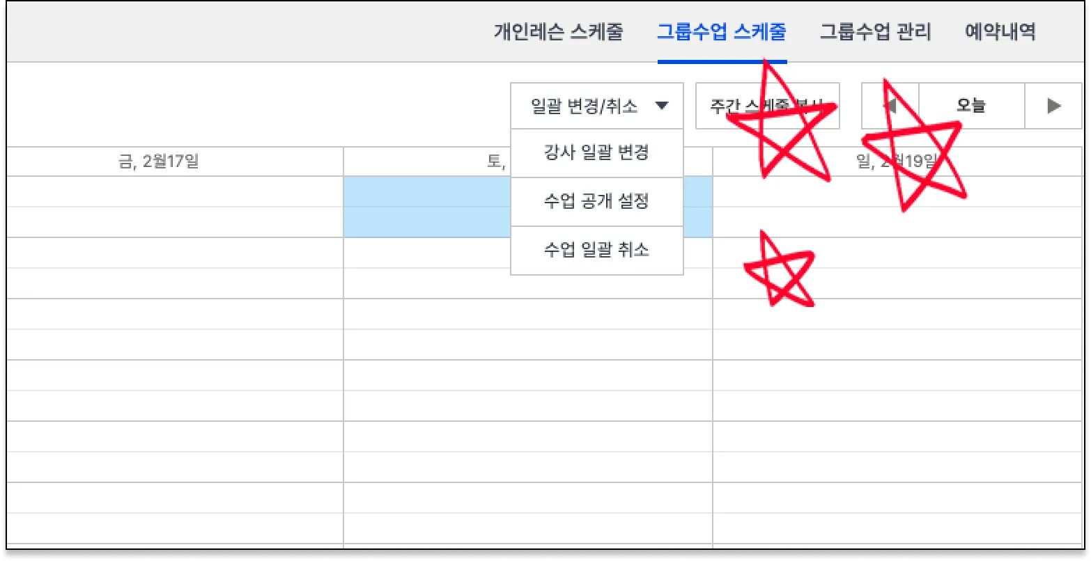 담당 강사 일괄 변경, 수업 공개/미공개 일괄 변경 기능은 스케줄러 > 그룹수업 스케줄러의 오른쪽 상단에서 변경할 수 있어요!