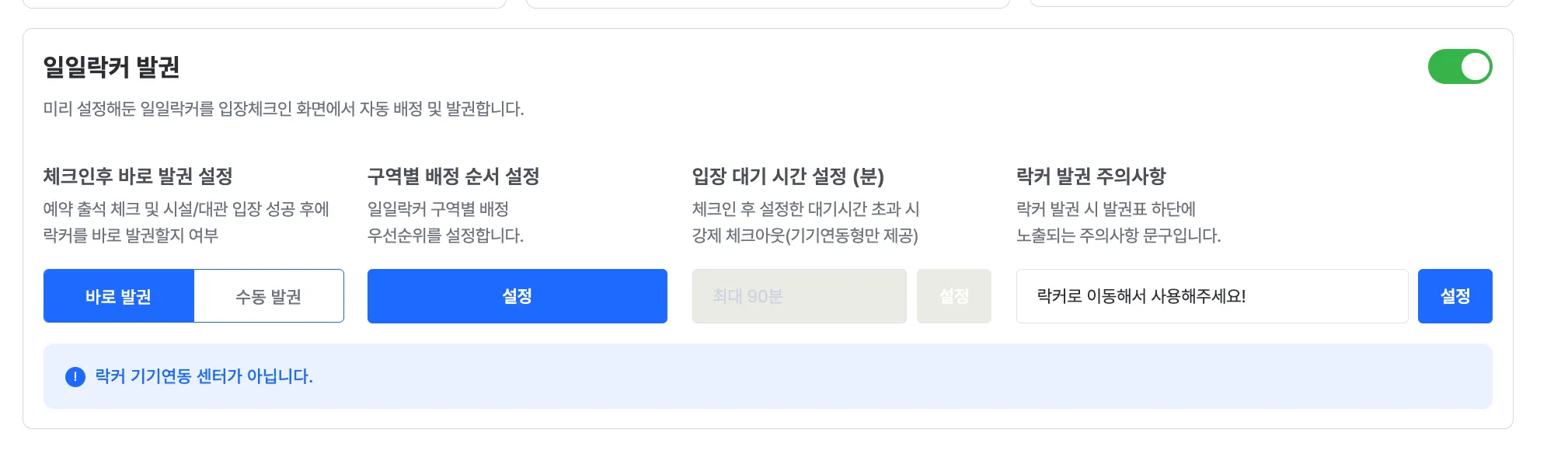 센터설정 > 입장관리 에서 일일락커 발권을 켜보세요! 수업 예약 확인 후 출석체크나, 시설이용권 입장하면서 바로 일일락커 발권 기능이 추가되었어요.