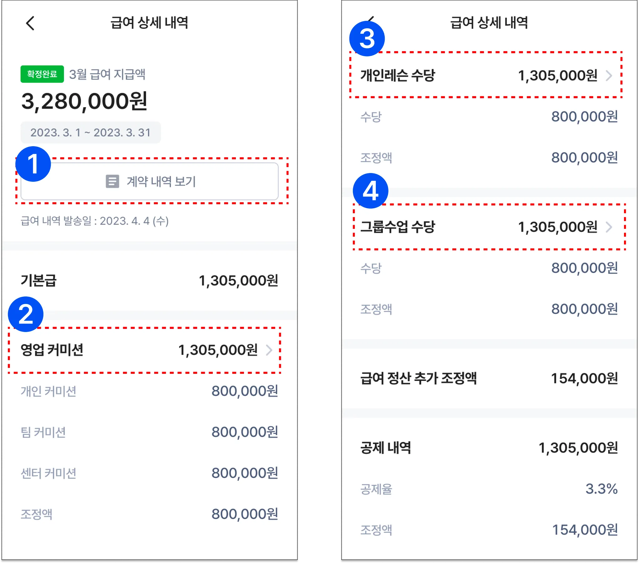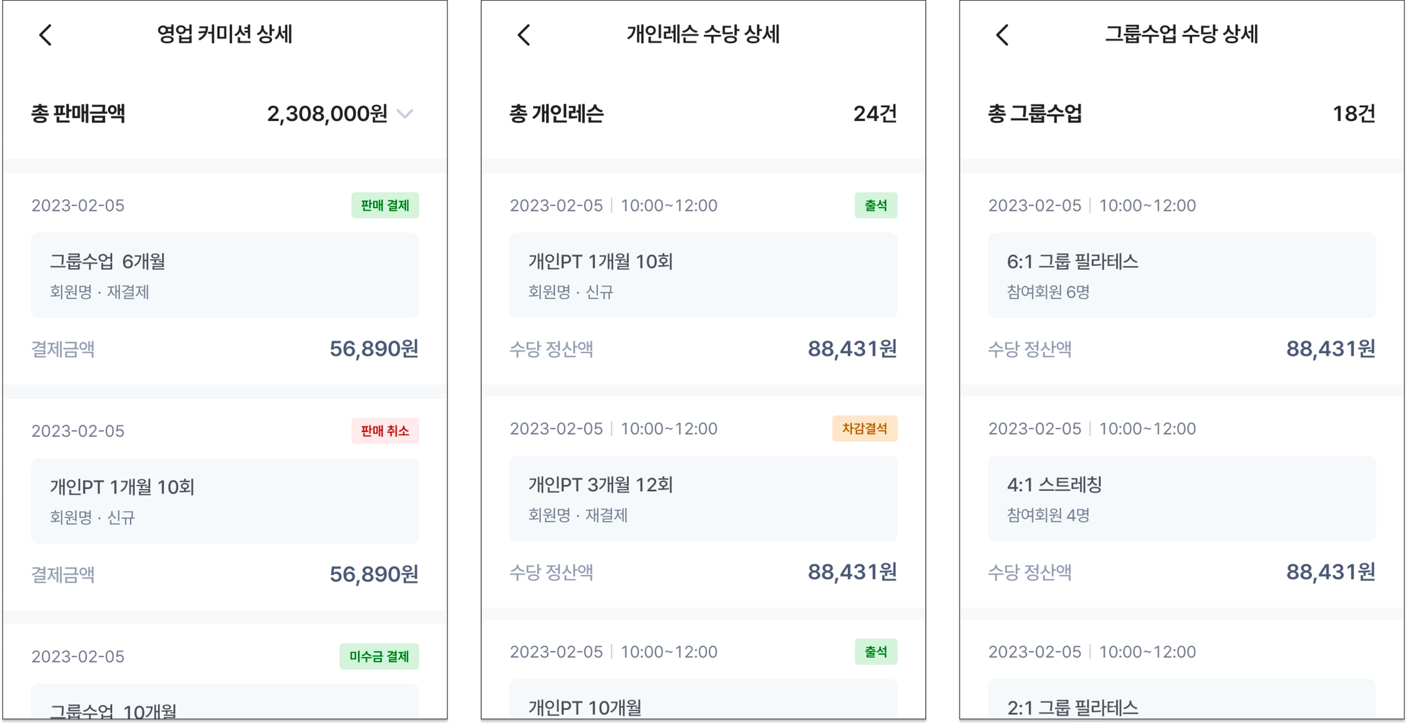 영업 커미션, 개인레슨 수당, 그룹수업 수당의 상세 내역을 모두 확인할 수 있어요.