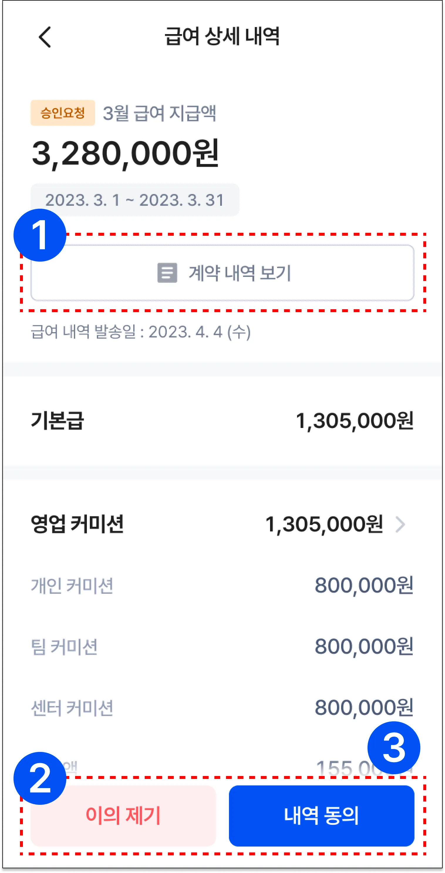 승인 요청 사항을 확인할 수 있고, 급여 내역서를 확인 후 동의나 이의제기를 진행할 수 있어요.