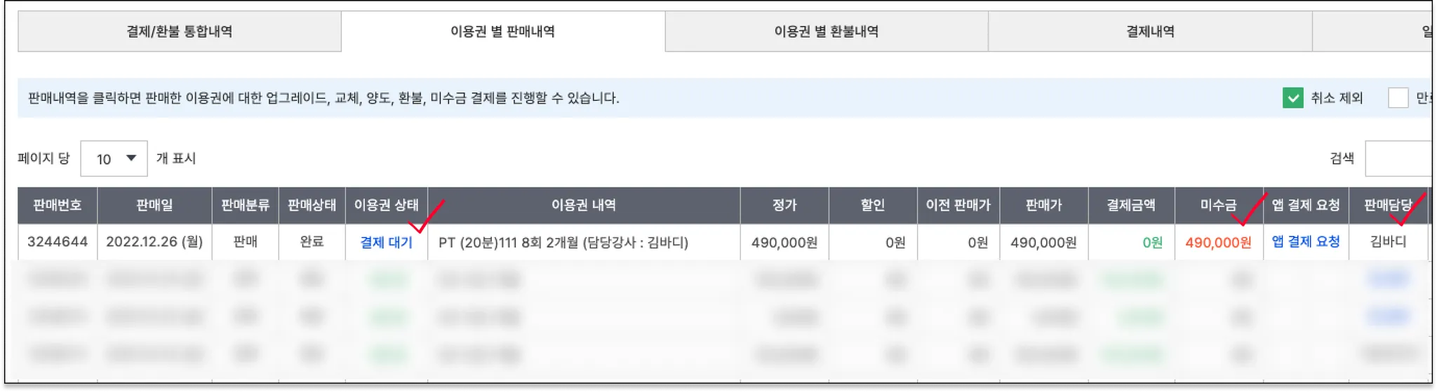 이용권 상태는 ’결제 대기’ 상태이며, 결제가 되지 않았기 때문에 ’미수금’으로 남아있어요. 판매 담당자도 요청 전 지정한 담당자로 나옵니다.
