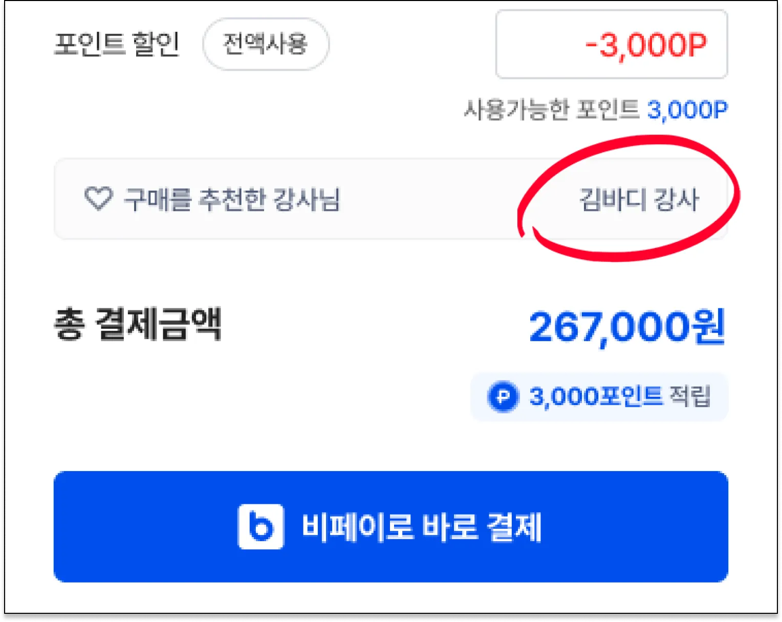 구매를 추천한 강사님이 김바디 강사님으로 표시되요.