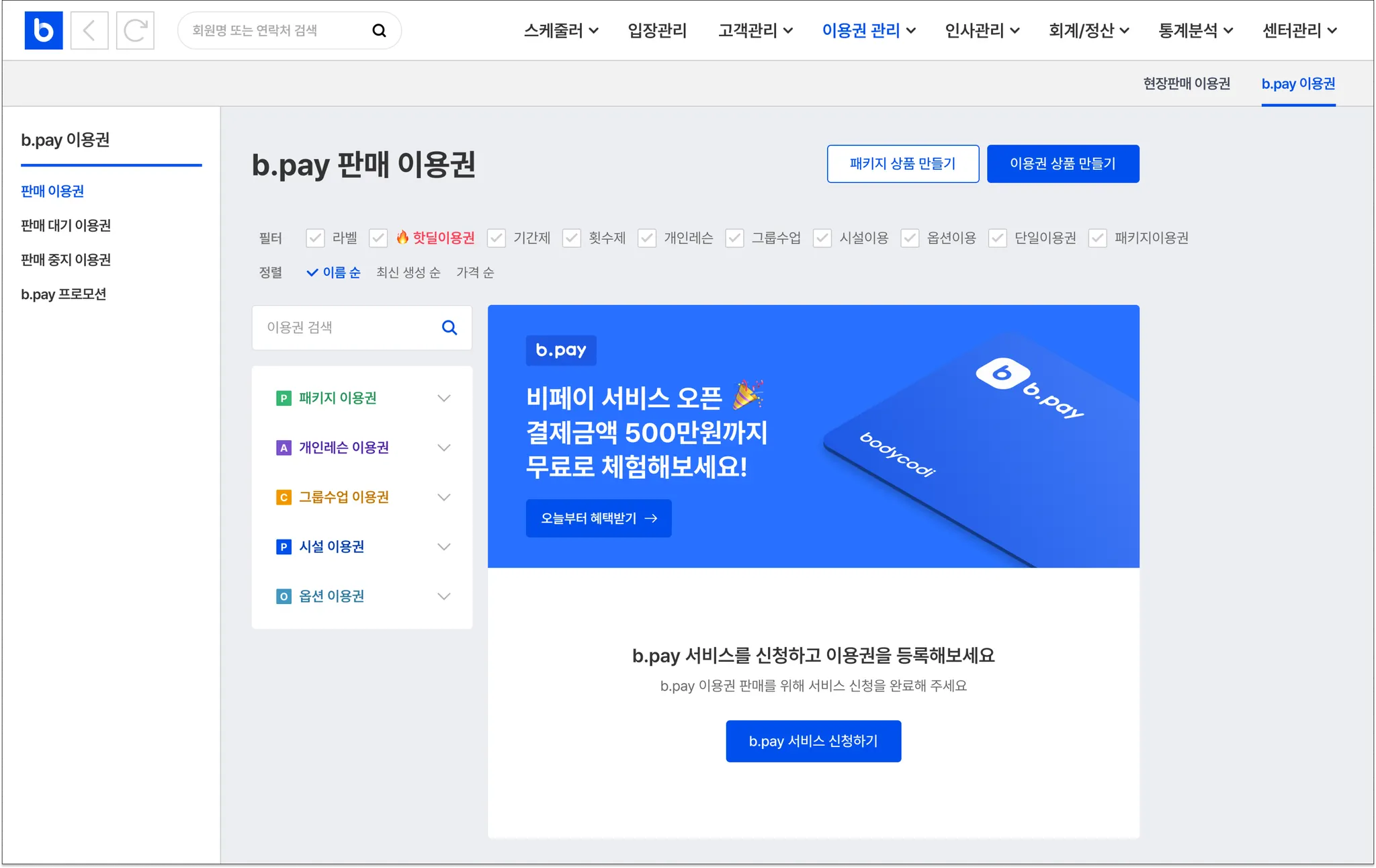 이용권관리 > b.pay이용권에서 서비스 가입을 신청할 수 있어요.