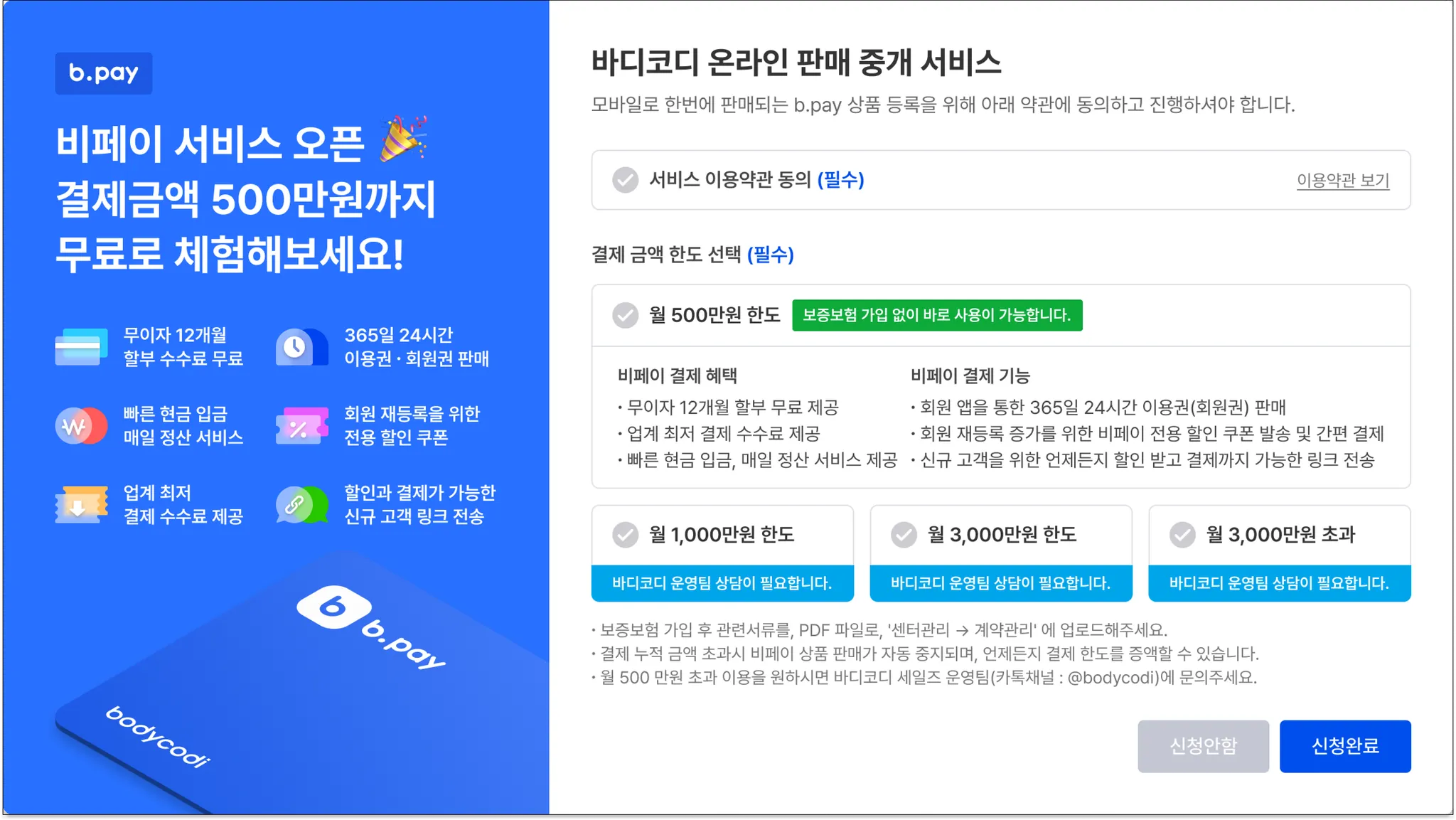 기본 월 1,000만원 한도로 가입이 가능해요. 한도를 늘리려면, 바디코디 운영팀으로 연락해주세요.