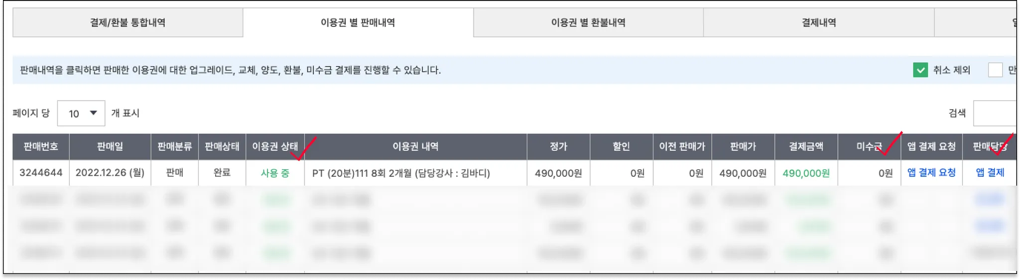 회원이 결제했다면, 이용권 상태는 ‘사용 중’으로 변경되요. 미수금은 없어지고 ‘결제 금액’이 생겼어요. ‘판매담당자’는 ‘앱 결제’로 변경됩니다. (실제 판매 담당자가 변경되지 않아요! 지정한 판매담당자로 기록됩니다.)