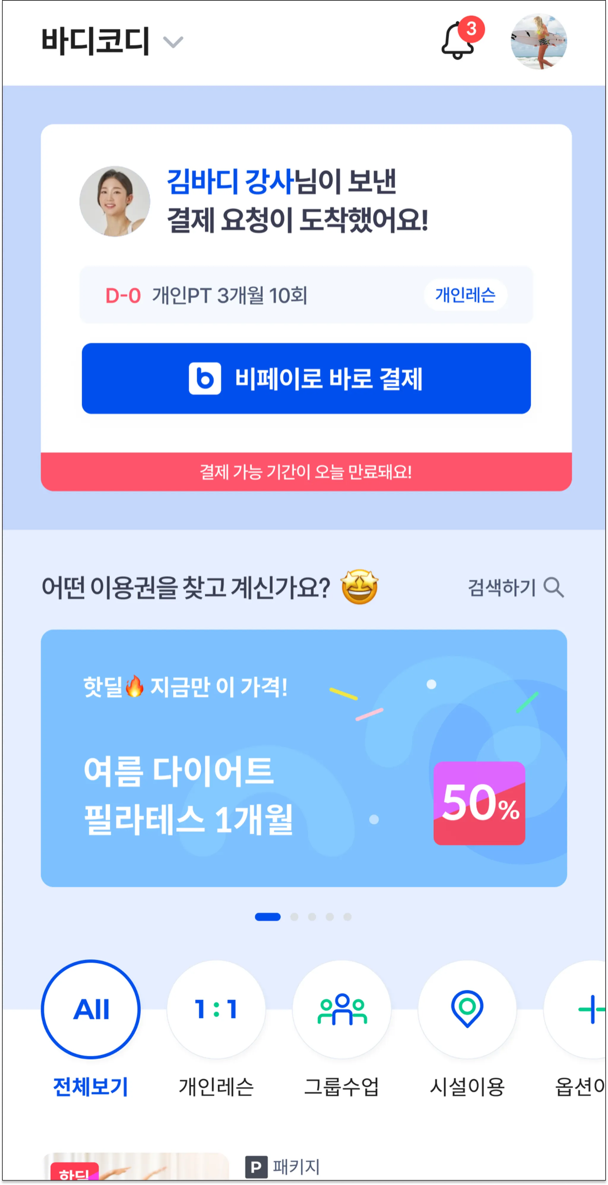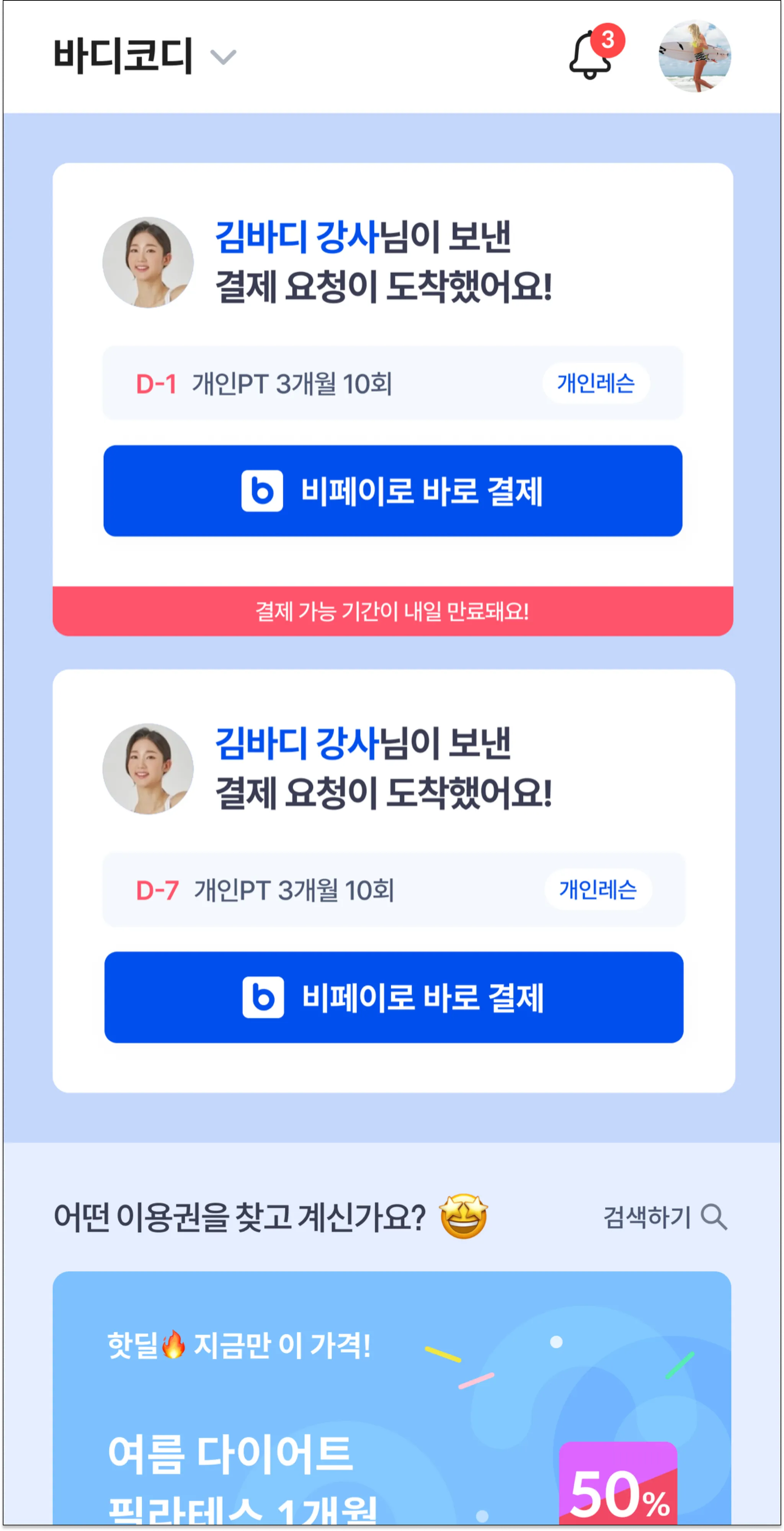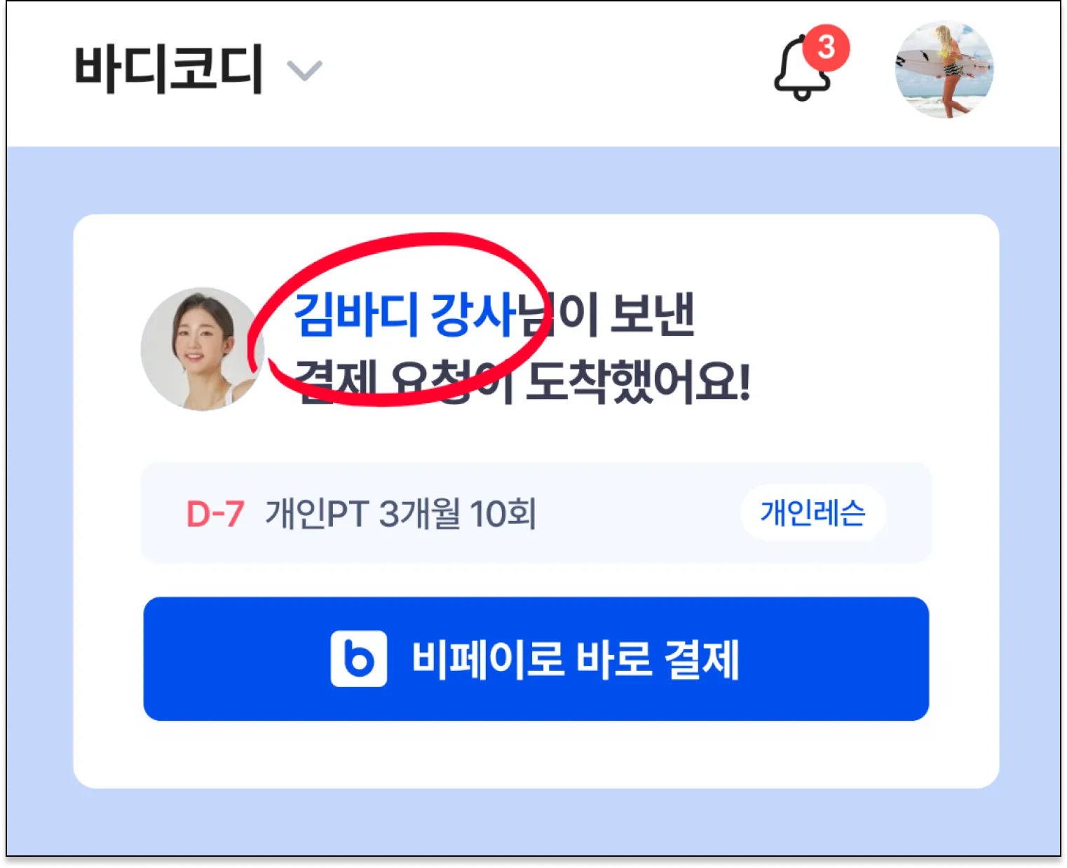 김바디 강사님에게 결제 요청이 왔다고 표시되요.