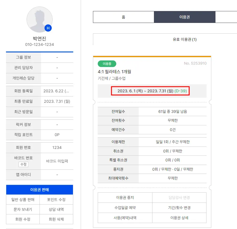 방법 : PC > 회원검색 > 회원클릭 > 이용권 > 기간 확인