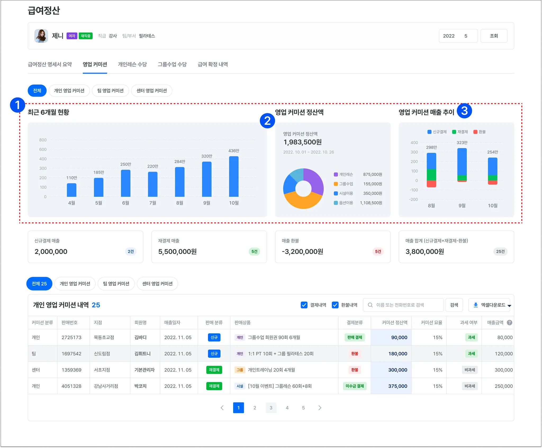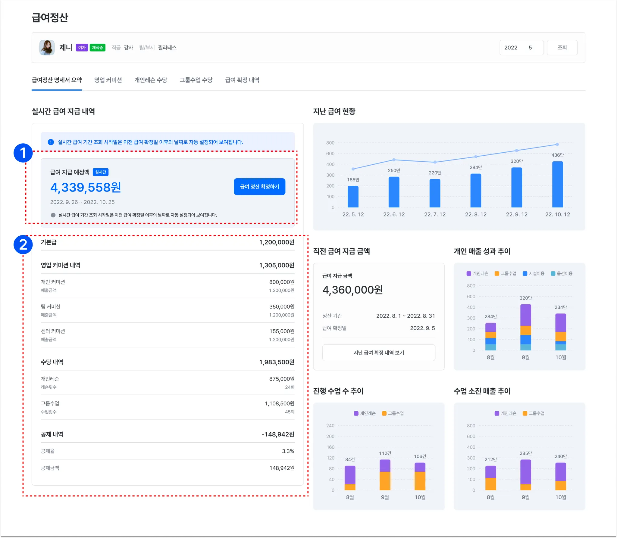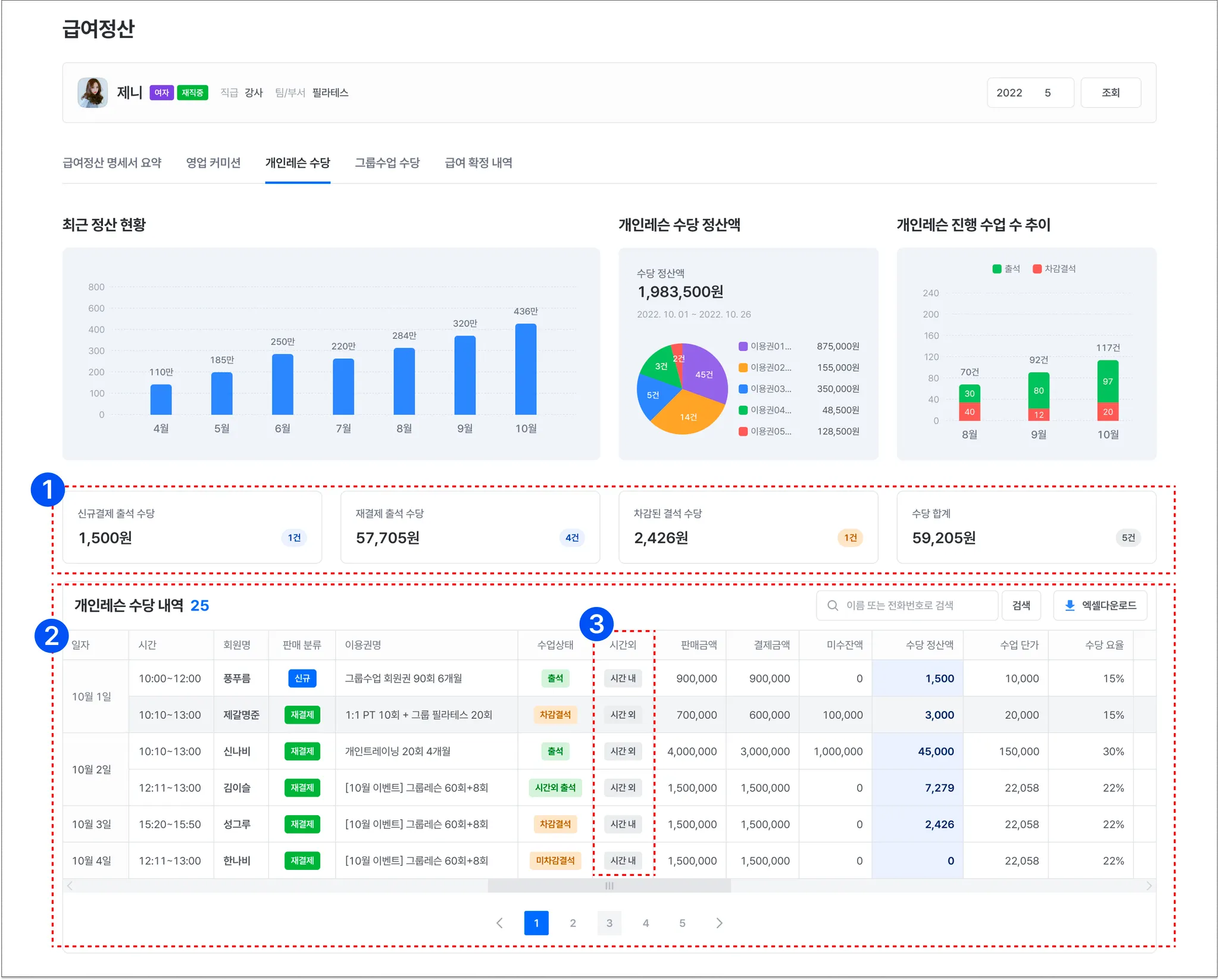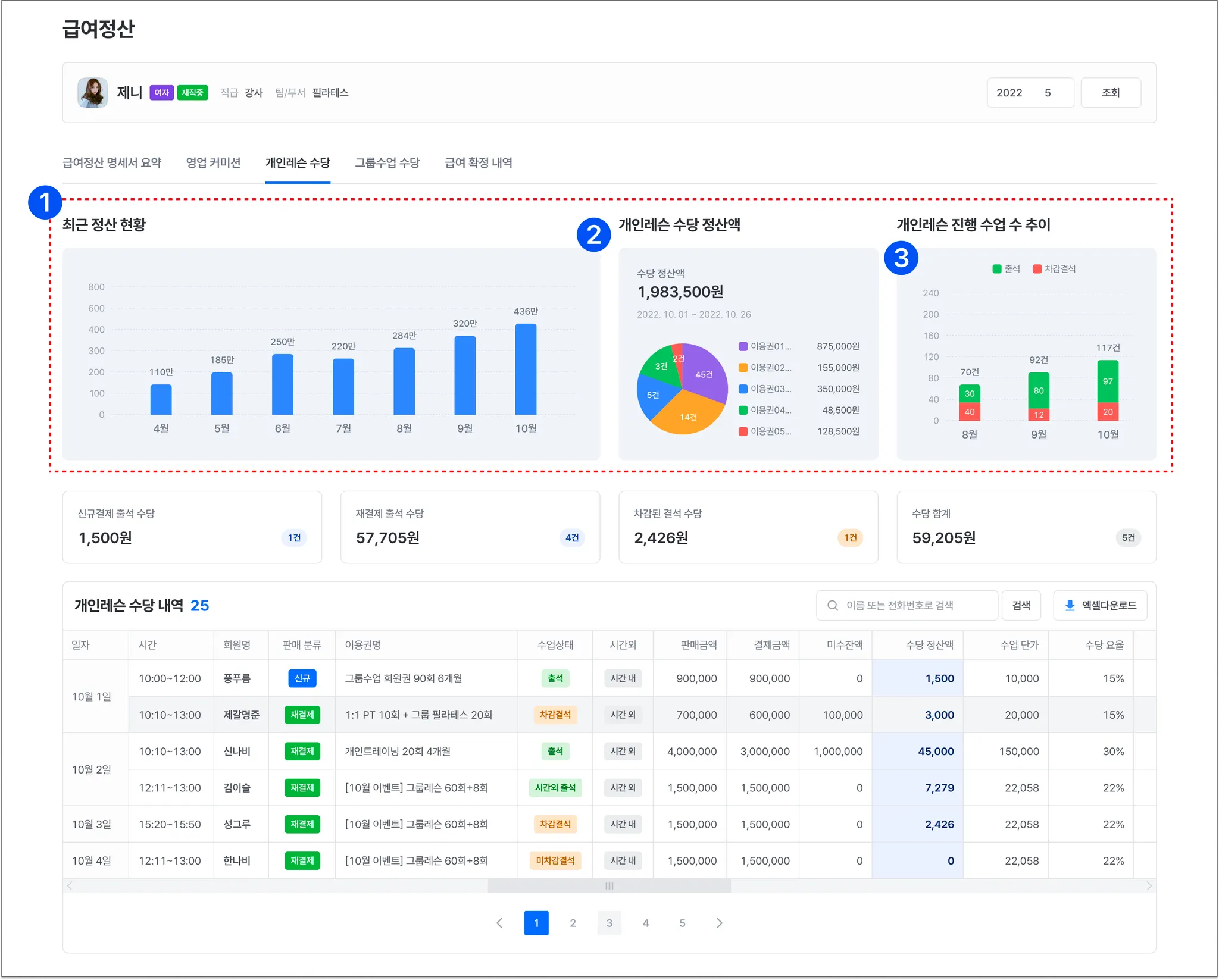 개인레슨 수당의 추이와 상세 내역을 모두 확인할 수 있어요.
