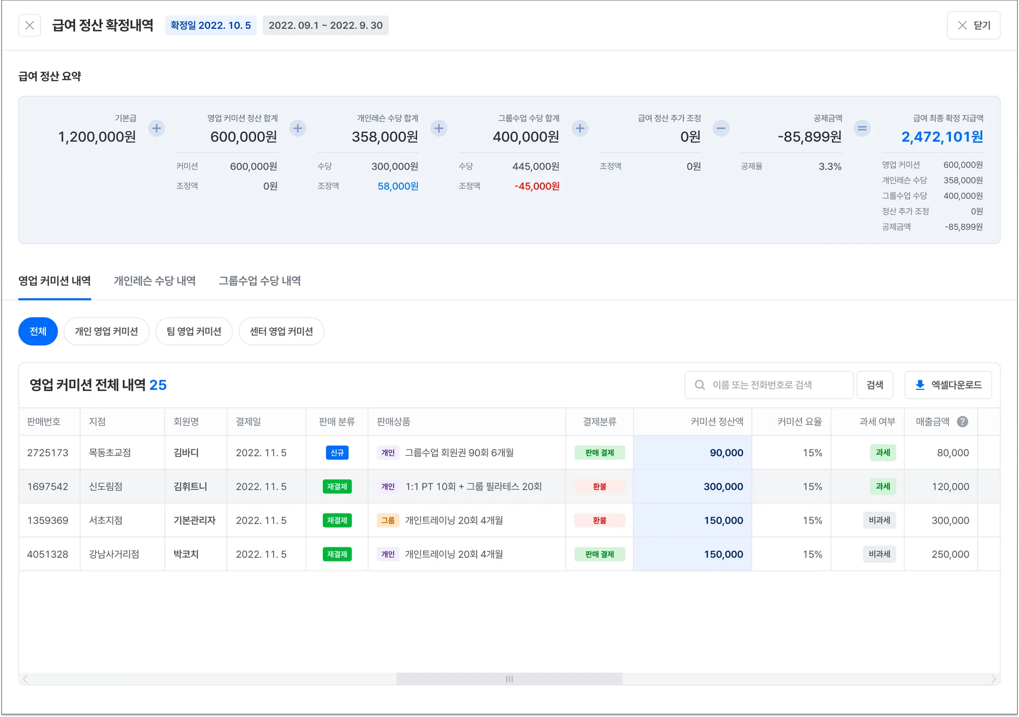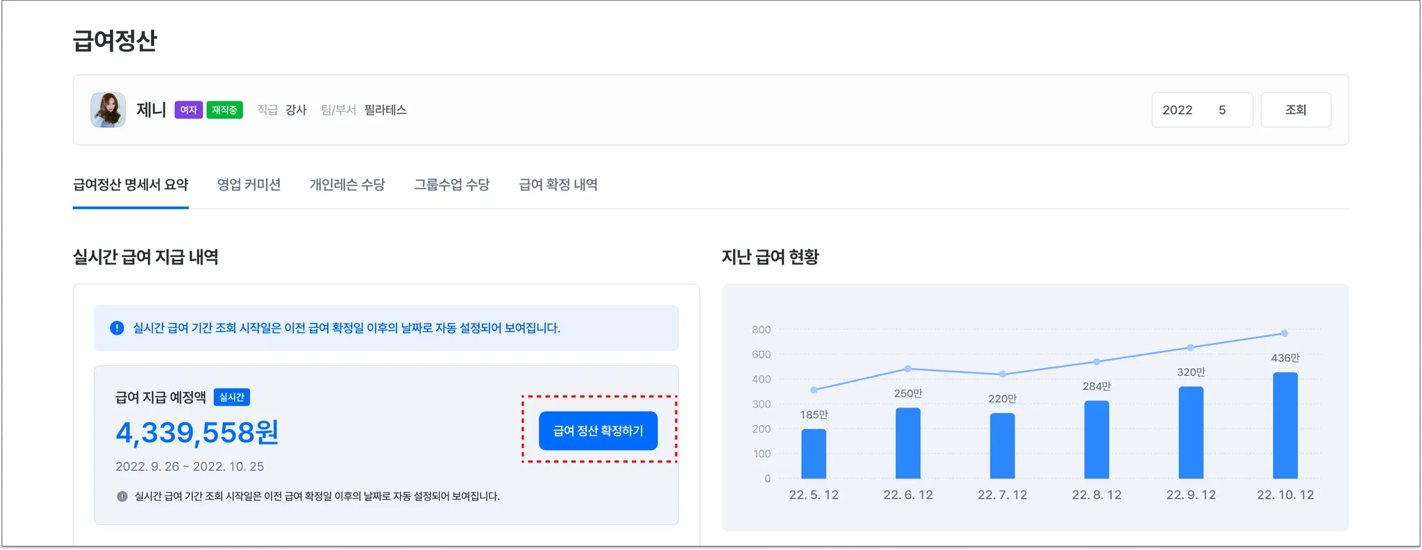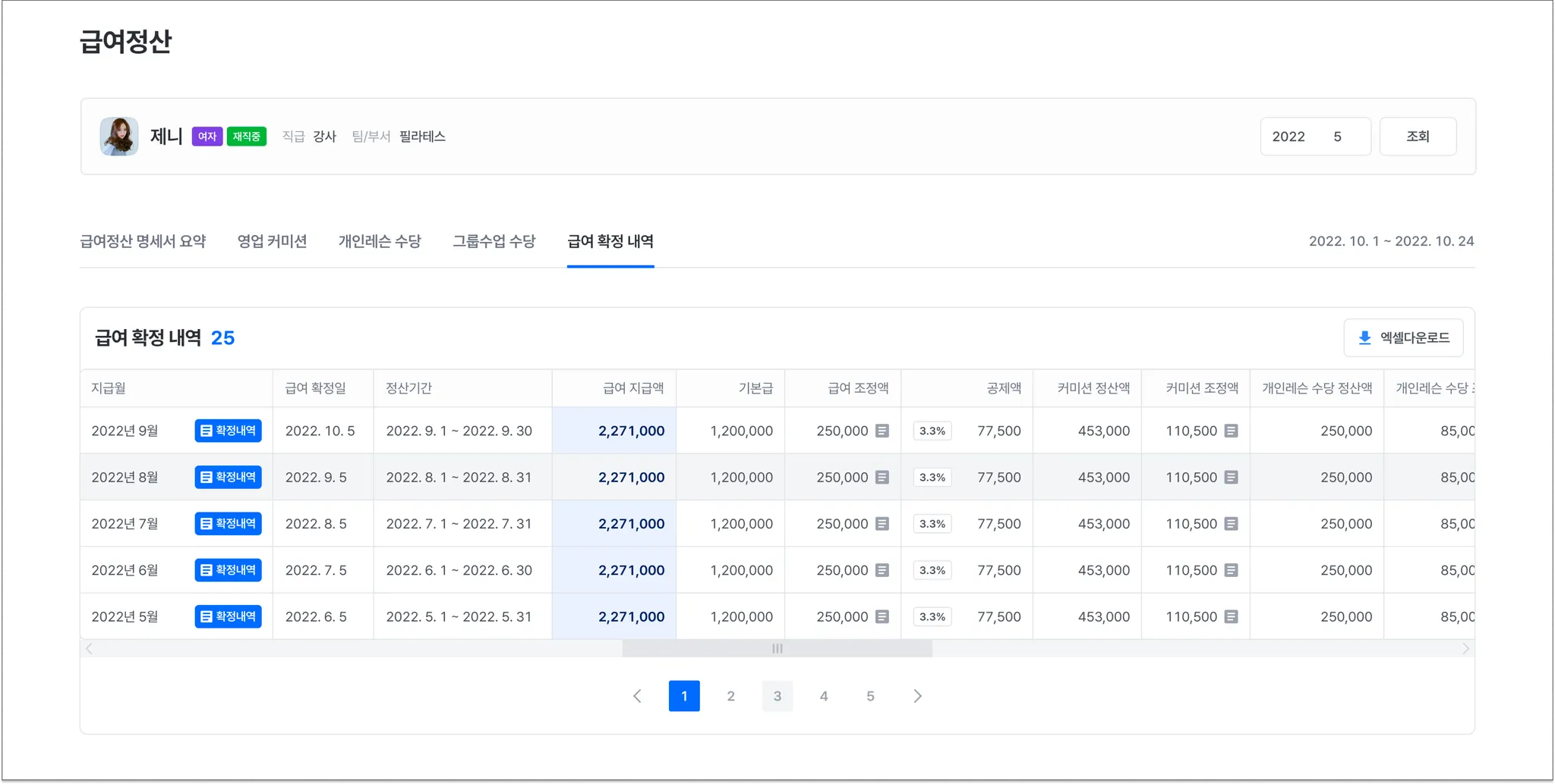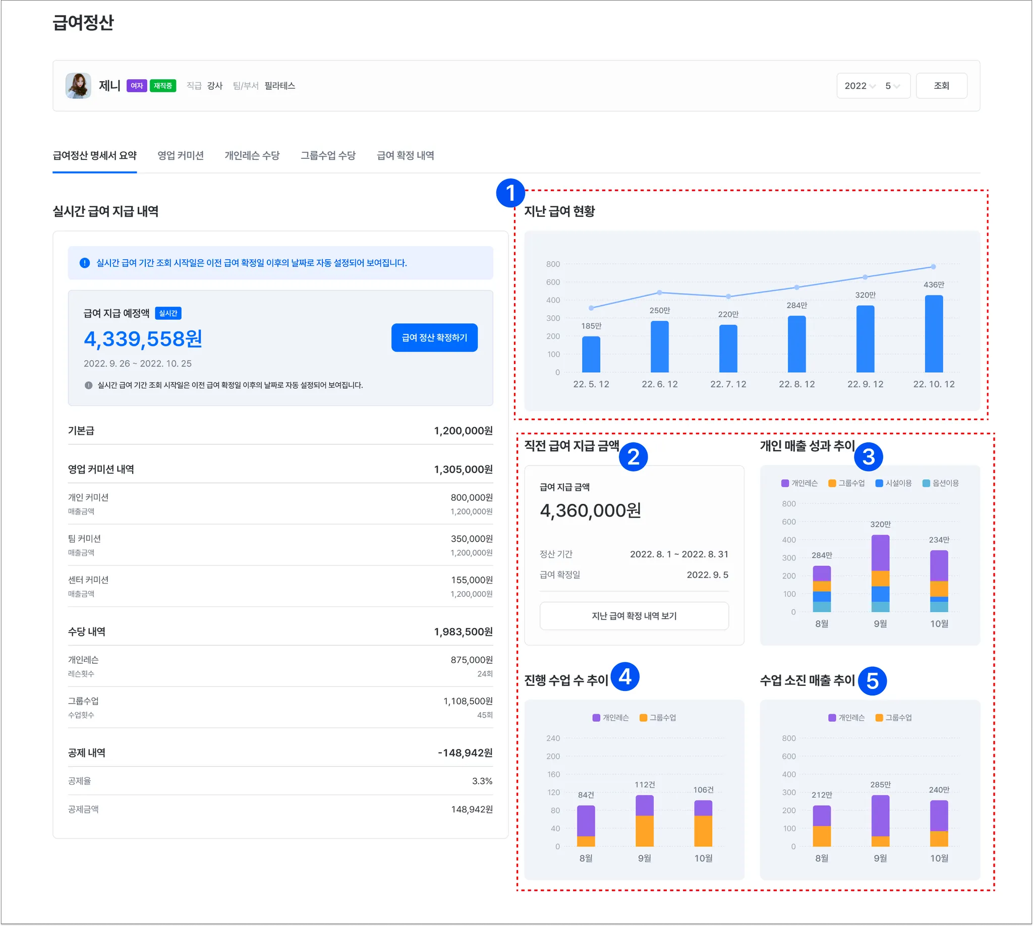 개인레슨 수당의 추이와 상세 내역을 모두 확인할 수 있어요.