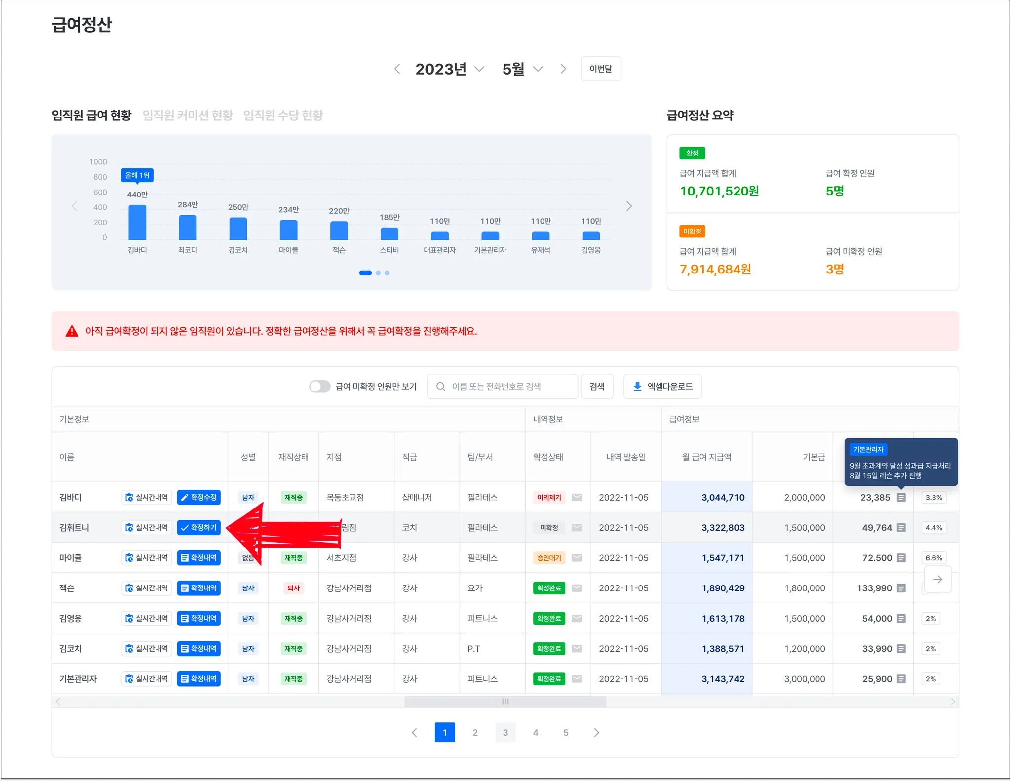급여정산 > 임직원 목록에서 ‘확정하기’ 버튼을 눌러주세요.