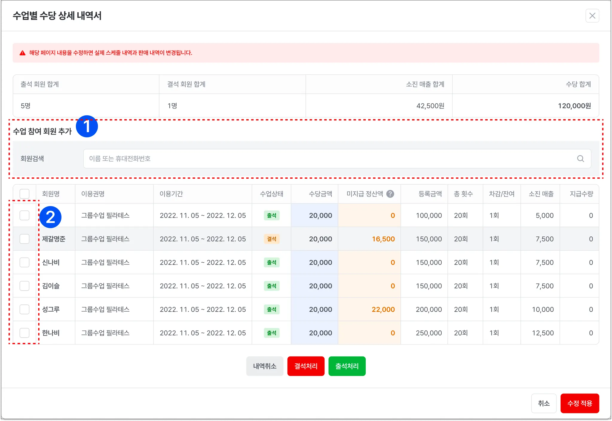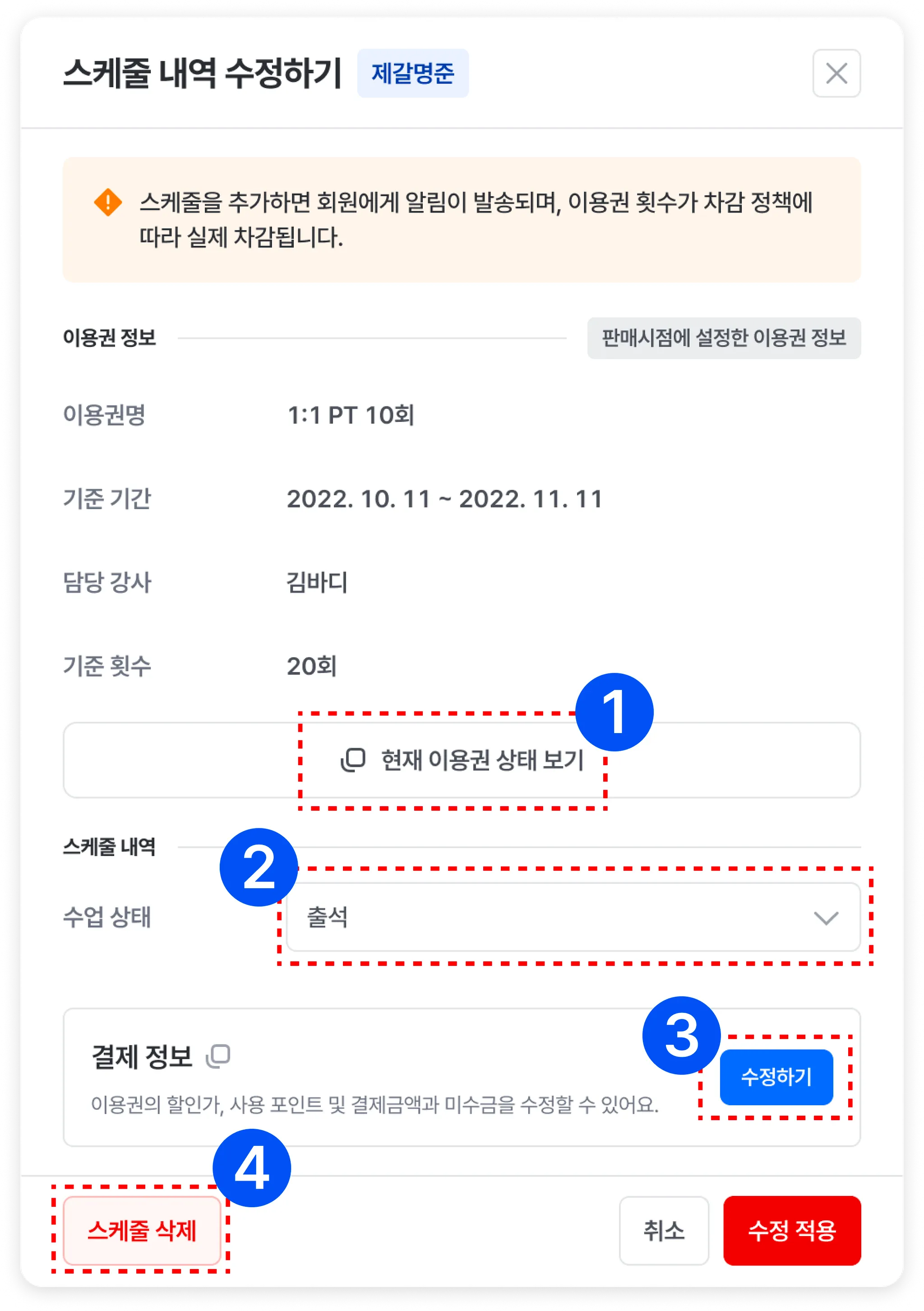 실제 내역이 수정되고, 이미 진행한 레슨의 출석 및 결석을 추가할 경우 회원에게 알림이 가니 신중히 진행해주세요!