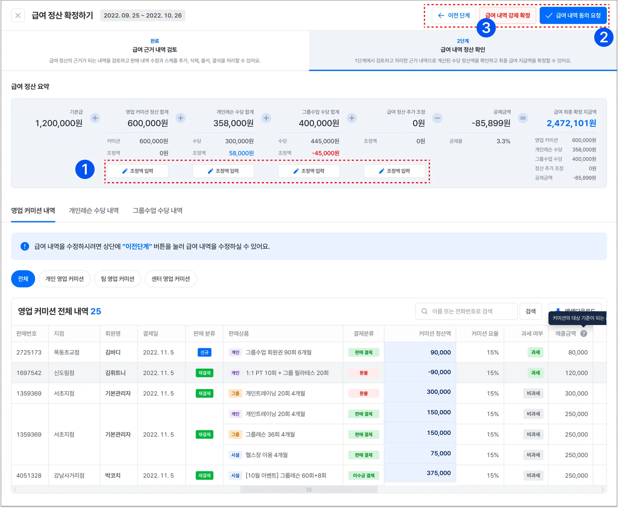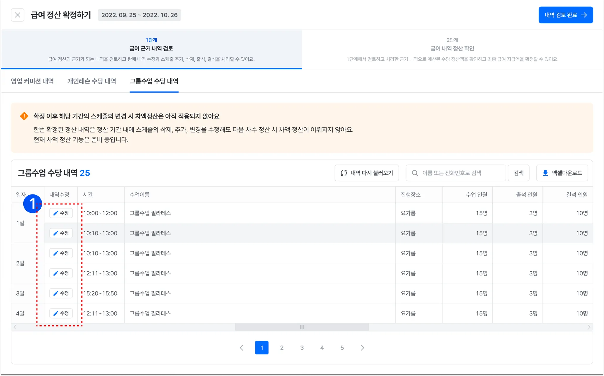 급여 근거 내역 검토 시 커미션, 개인레슨, 그룹수업의 내역을 수정할 수 있어요.