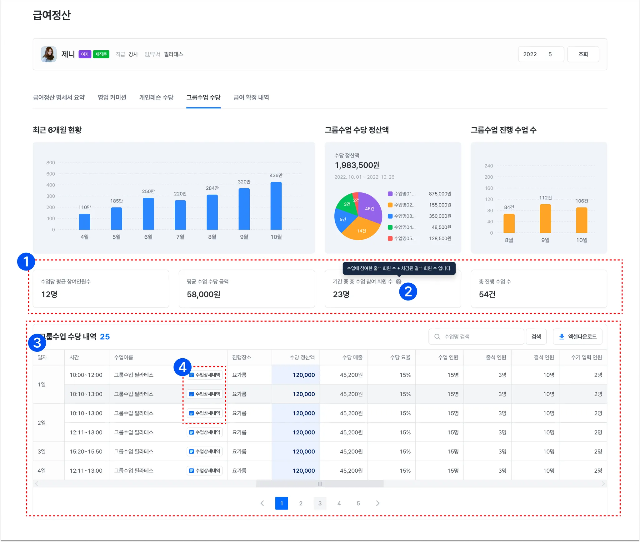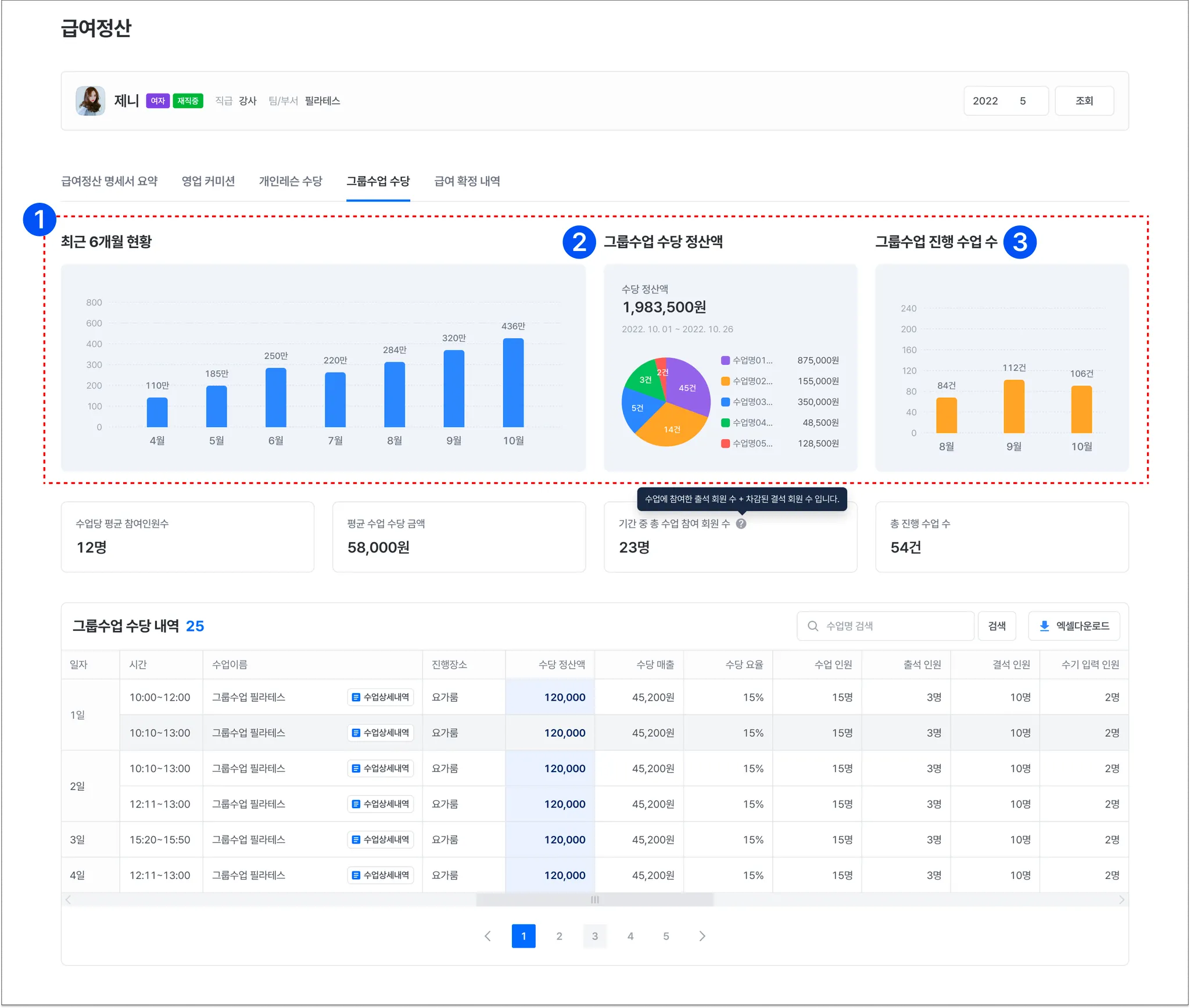 그룹수업의 수당 추이와 정산액, 수업 수를 손쉽게 확인할 수 있어요.