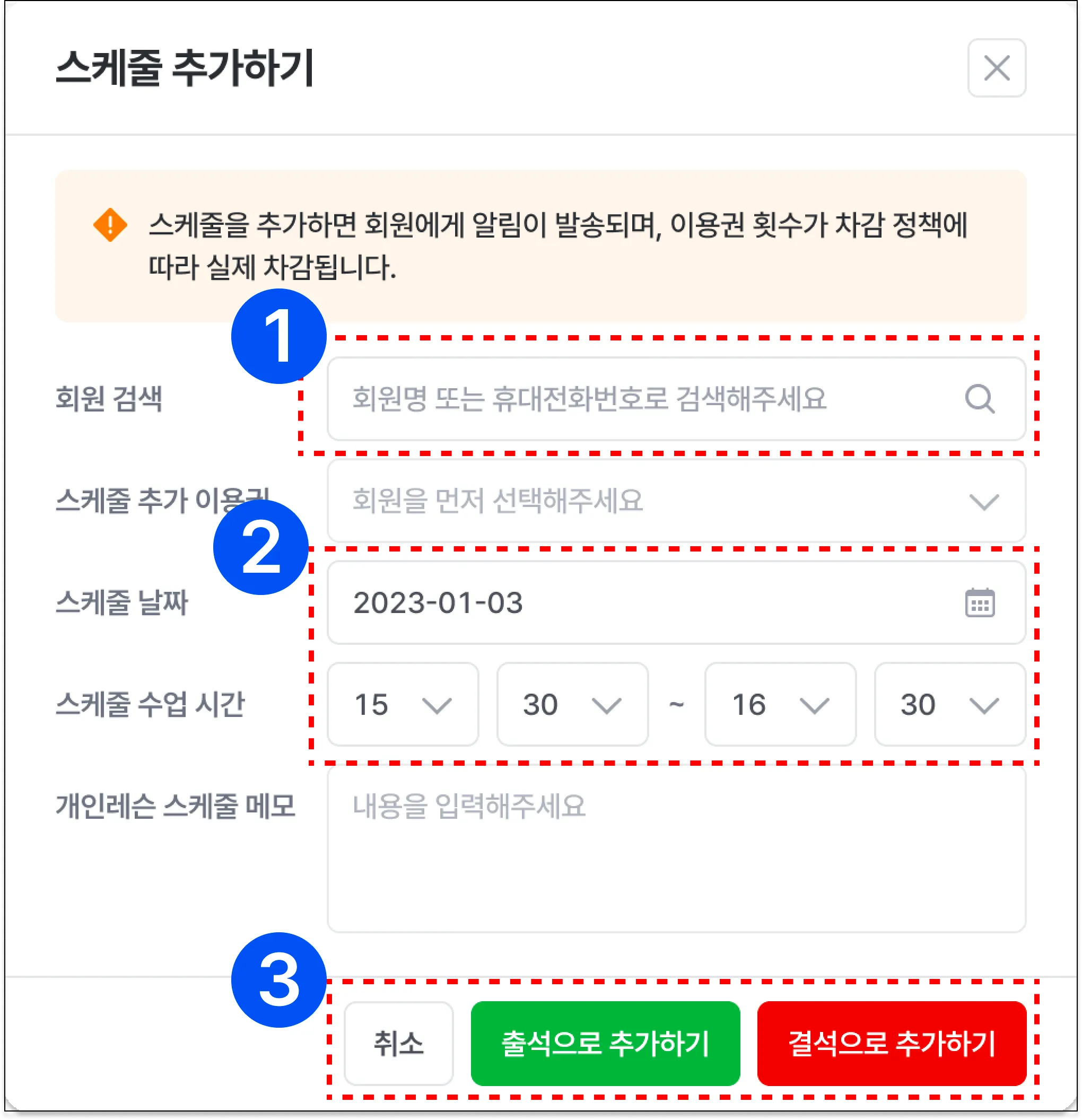 스케줄을 추가하면 회원에게 알림이 발송되며, 이용권 횟수가 차감 정책에 따라 실제 차감됩니다.