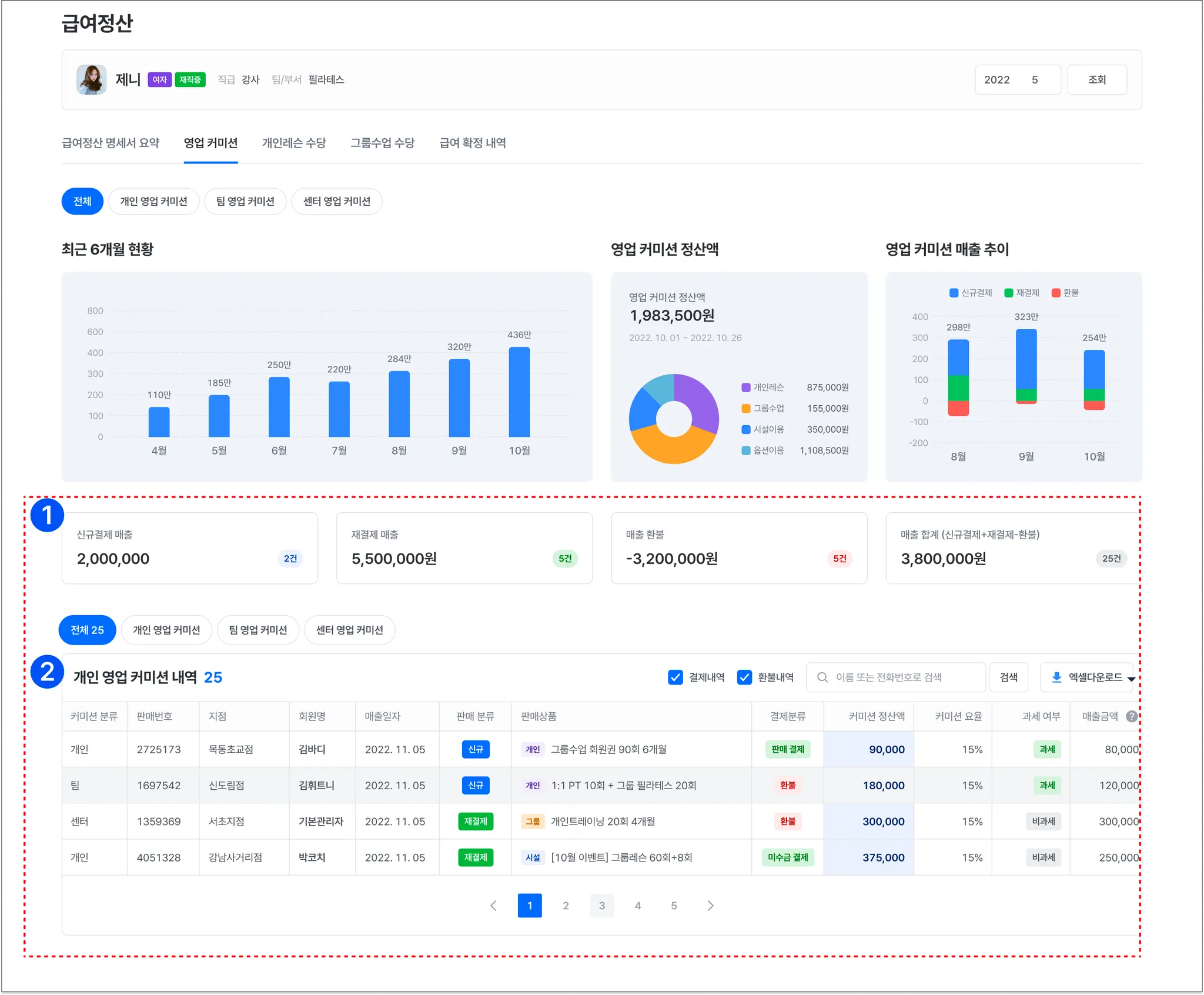 개인 매출 성과를 상세히 확인할 수 있어요.