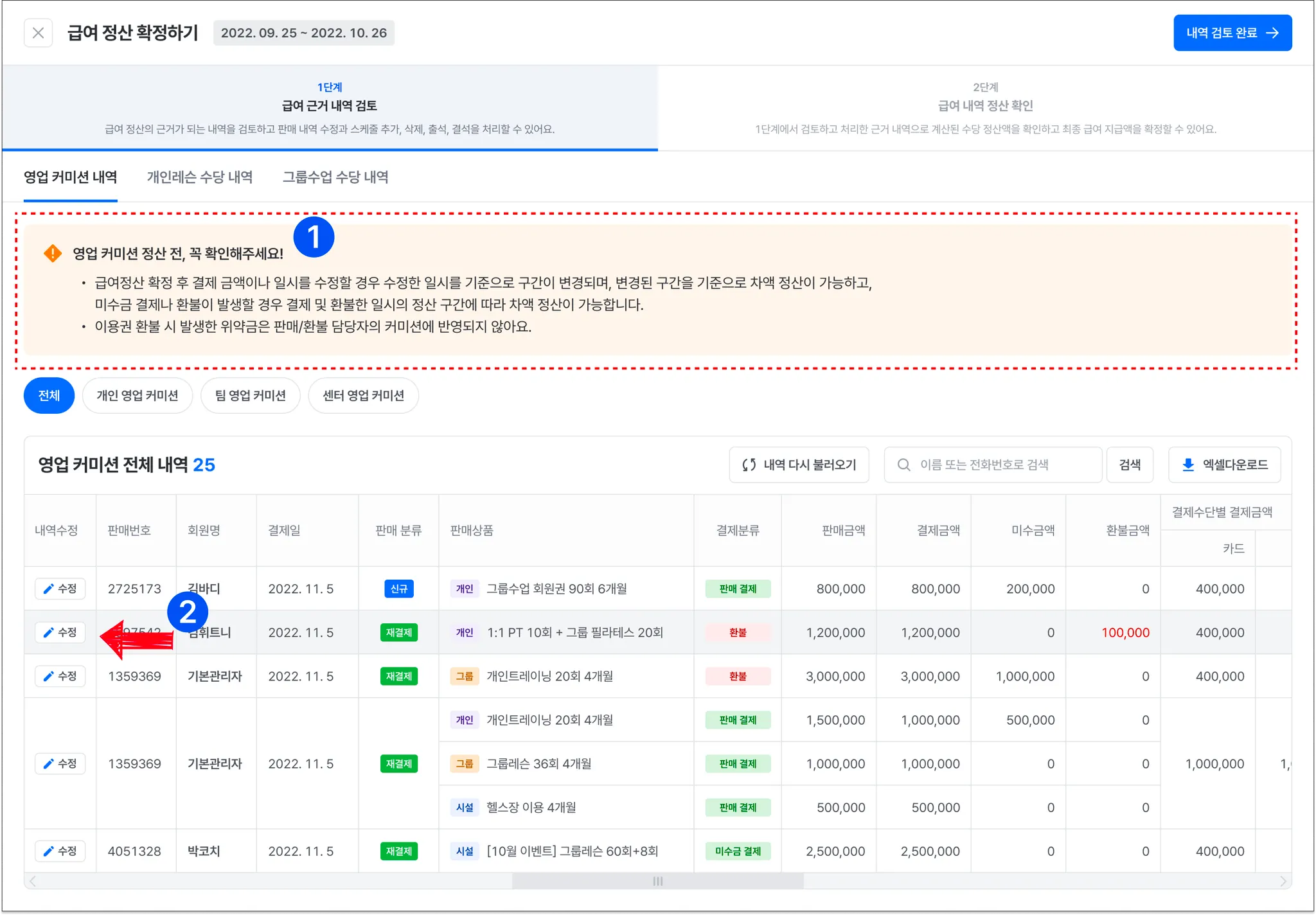 영업커미션 수정 시 판매 내역과 결제 정보를 수정할 수 있어요.