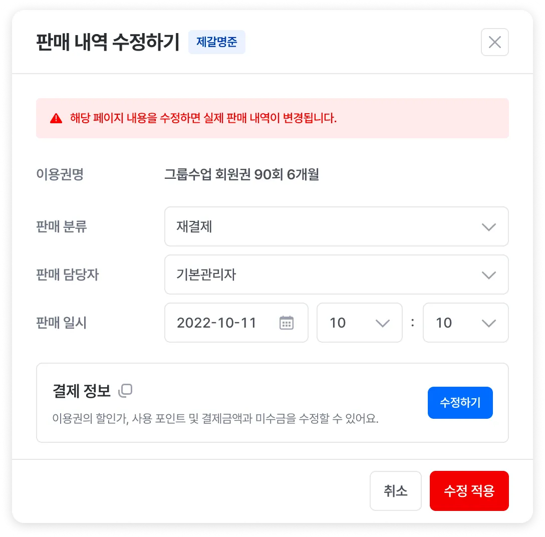 결제 정보 수정 창이에요. 판매금액과 결제금액, 쿠폰 적용 등 결제 정보를 수정할 수 있어요.