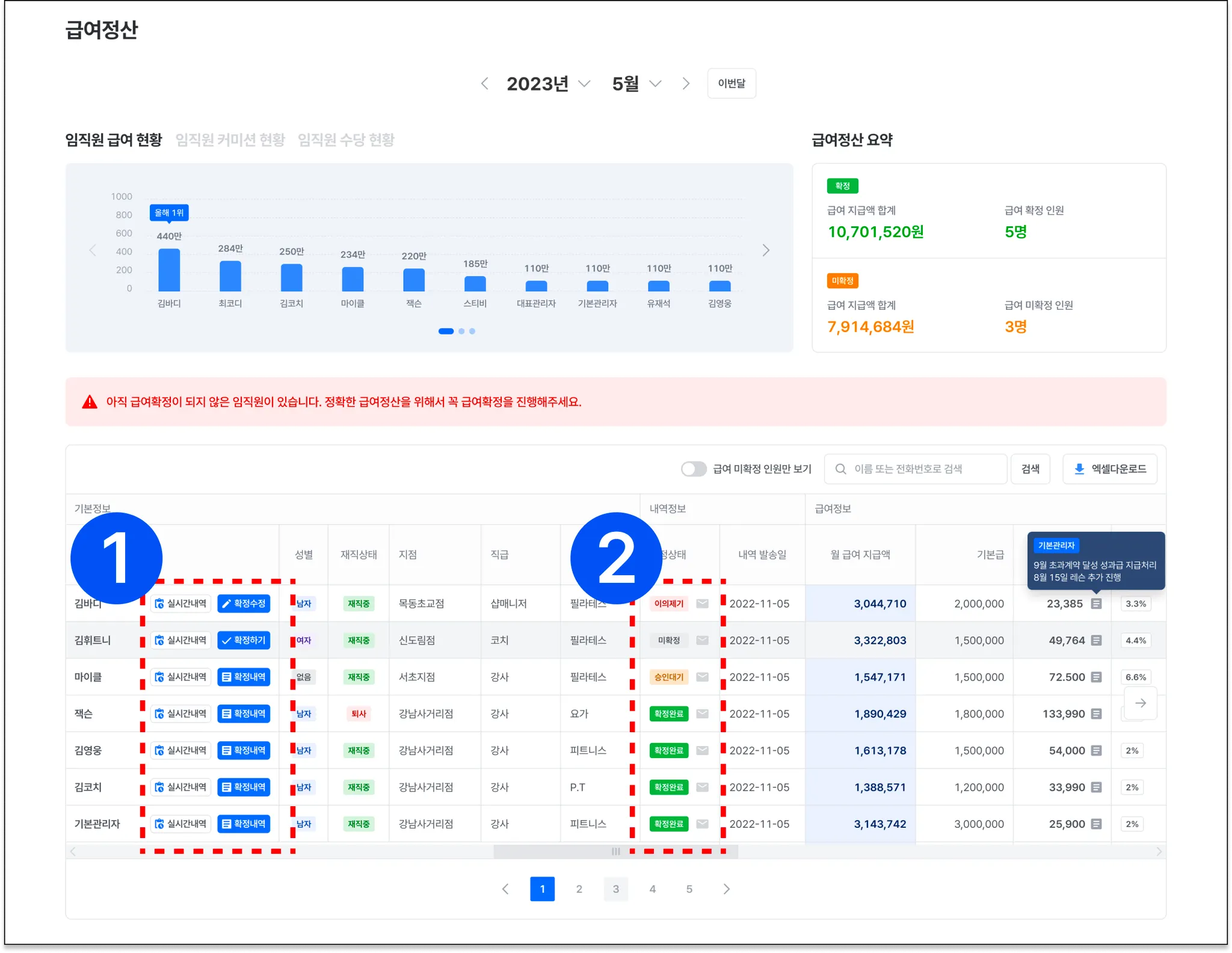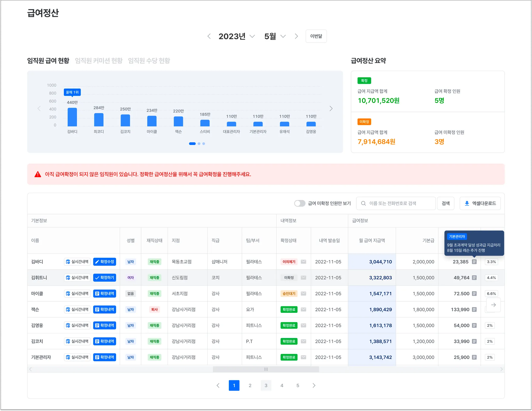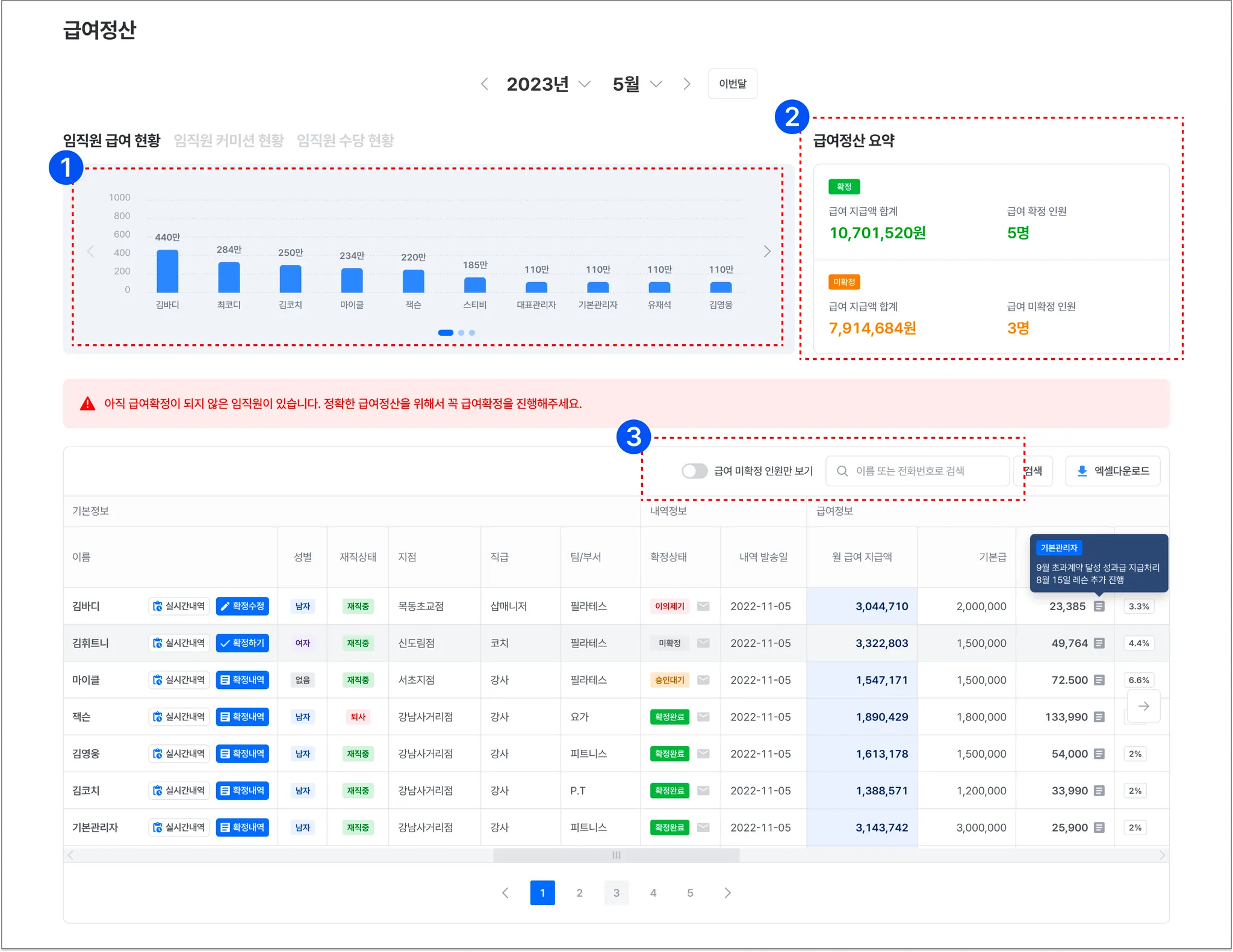 급여를 확정한 인원과, 급여액을 요약해서 보여주고, 미확정한 임직원을 놓치지 않도록 미확정 내역까지 확인할 수 있어요.