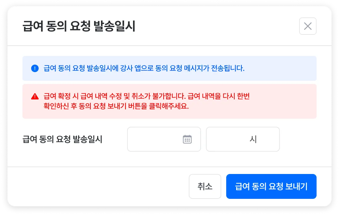 강사에게 급여 내역을 발송하고 동의를 요청합니다.