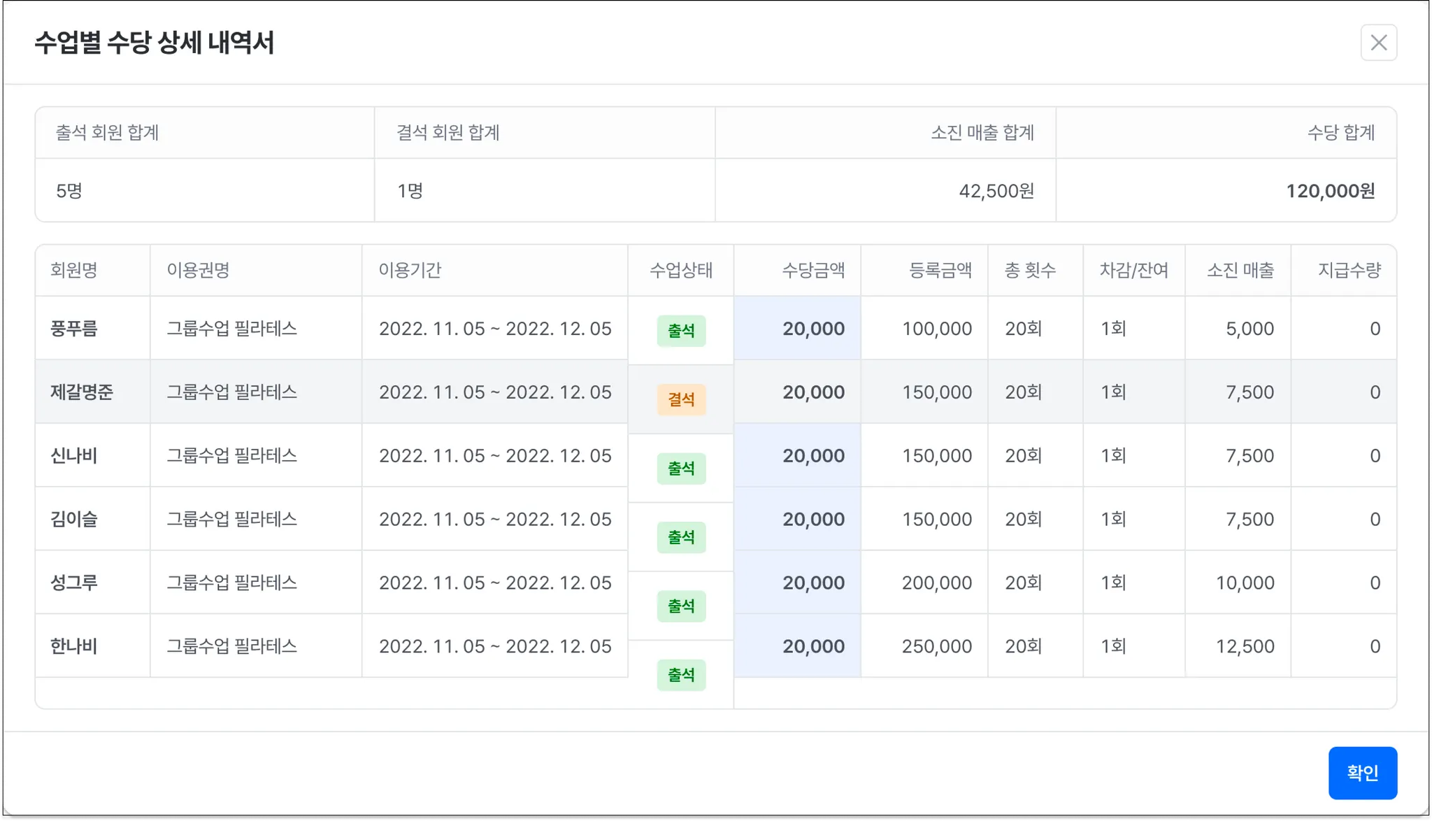 해당 수업의 참여 회원, 이용권 정보와 금액, 소진 매출을 확인할 수 있어요.