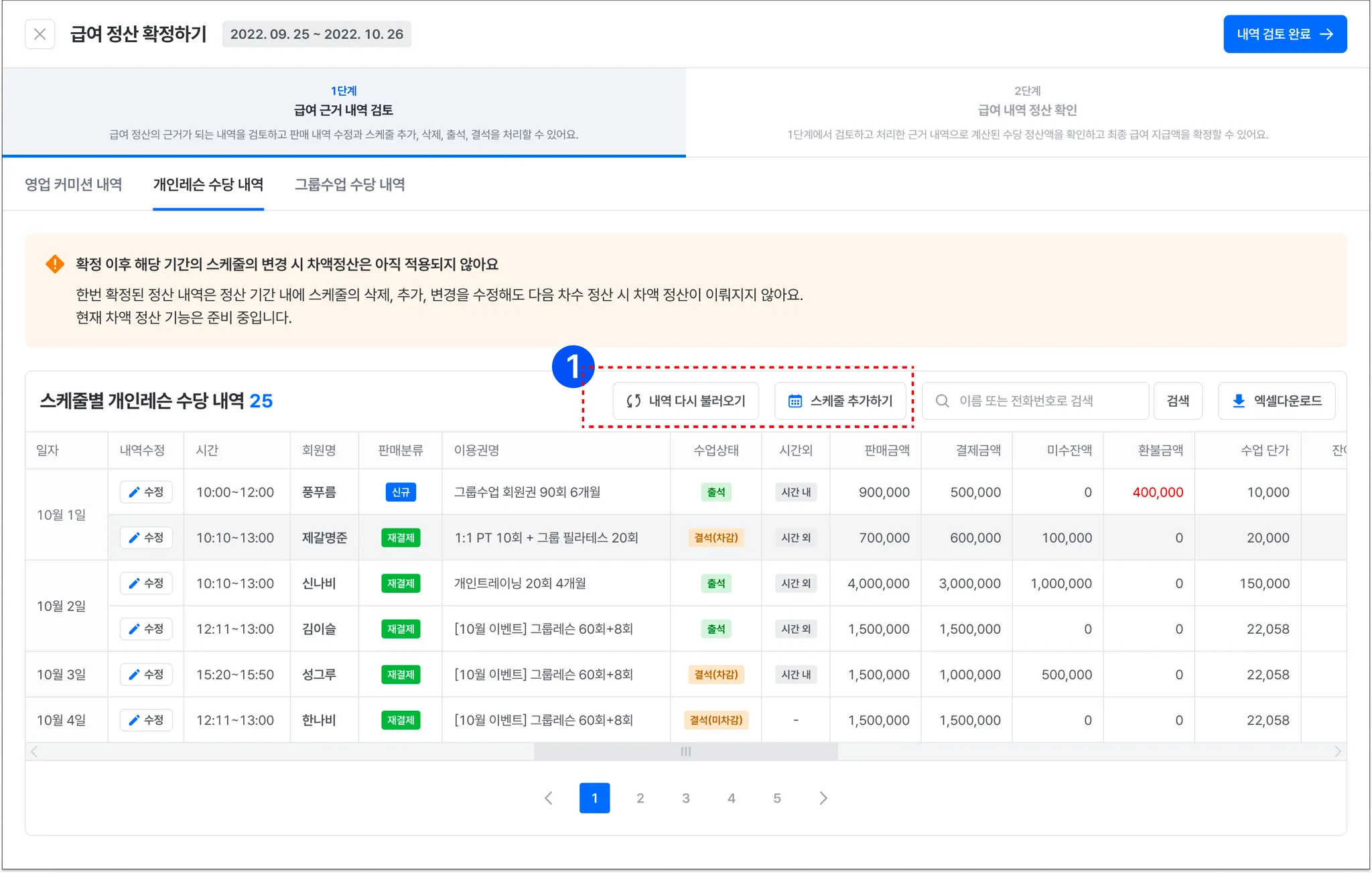 스케줄별 개인레슨의 수당 내역을 상세하게 확인할 수 있어요.