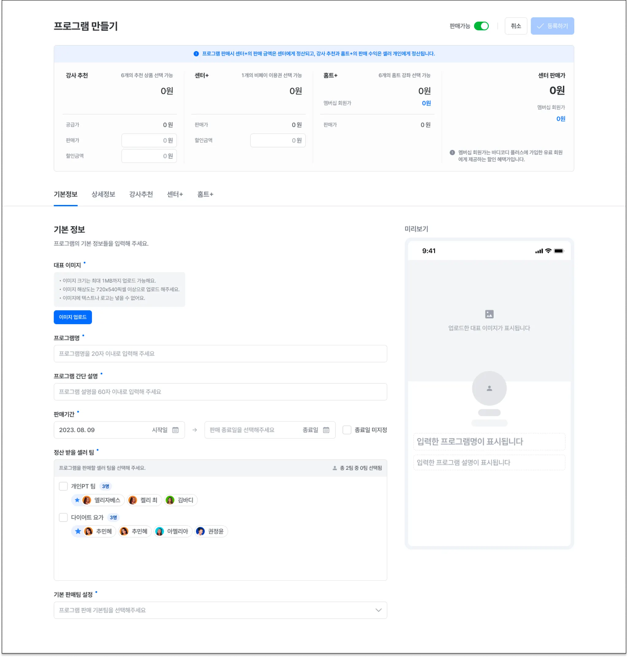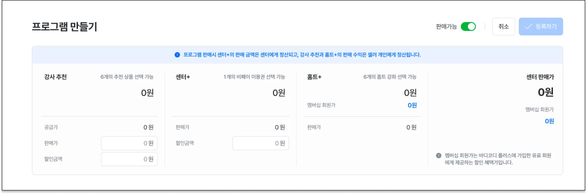 바디코디+ 프로그램의 이름과 설명, 판매 기간 등을 설정할 수 있는 기본 정보 입력 화면이에요.