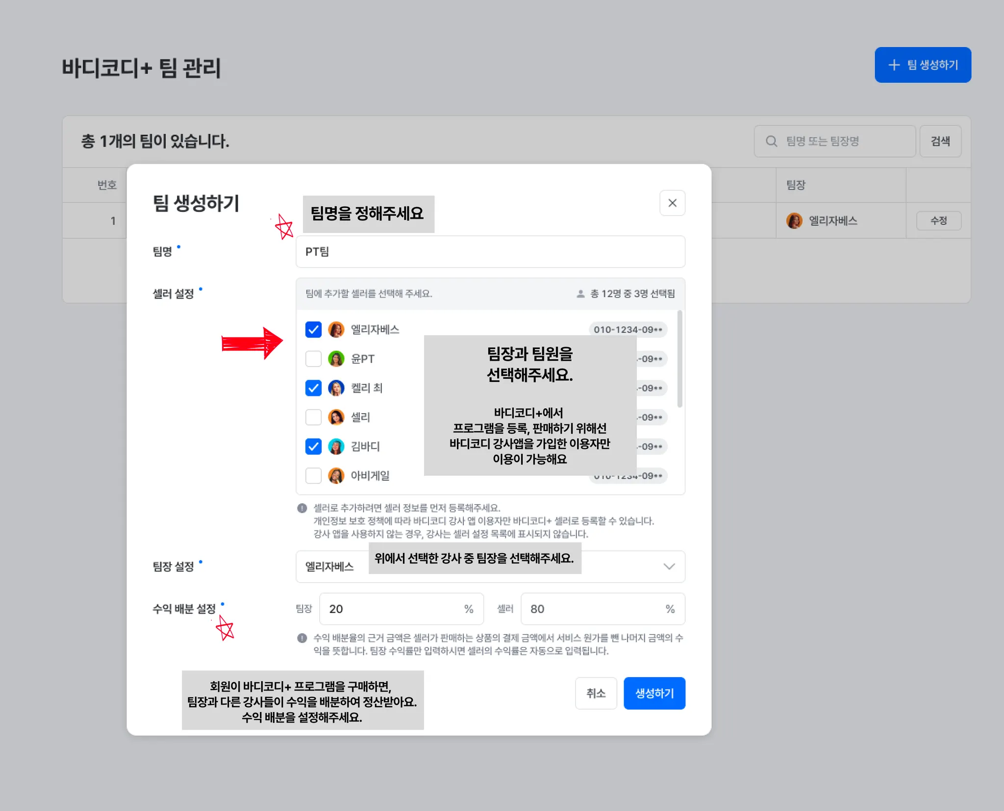 바디코디 플러스 프로그램을 등록하기 전, 바디코디+ 셀러로 구성된 ‘팀’을 만들어야해요.