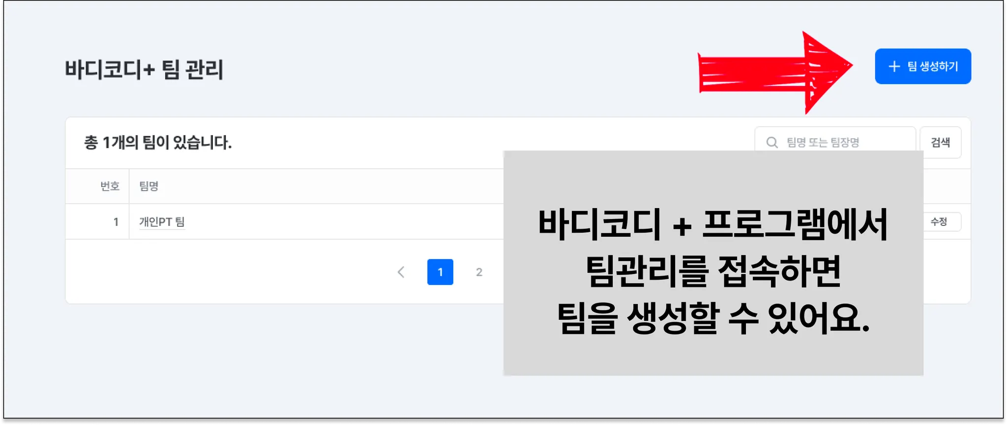 바디코디 플러스 팀은 바디코디 + 프로그램 > 팀 관리에서 생성, 관리할 수 있어요.