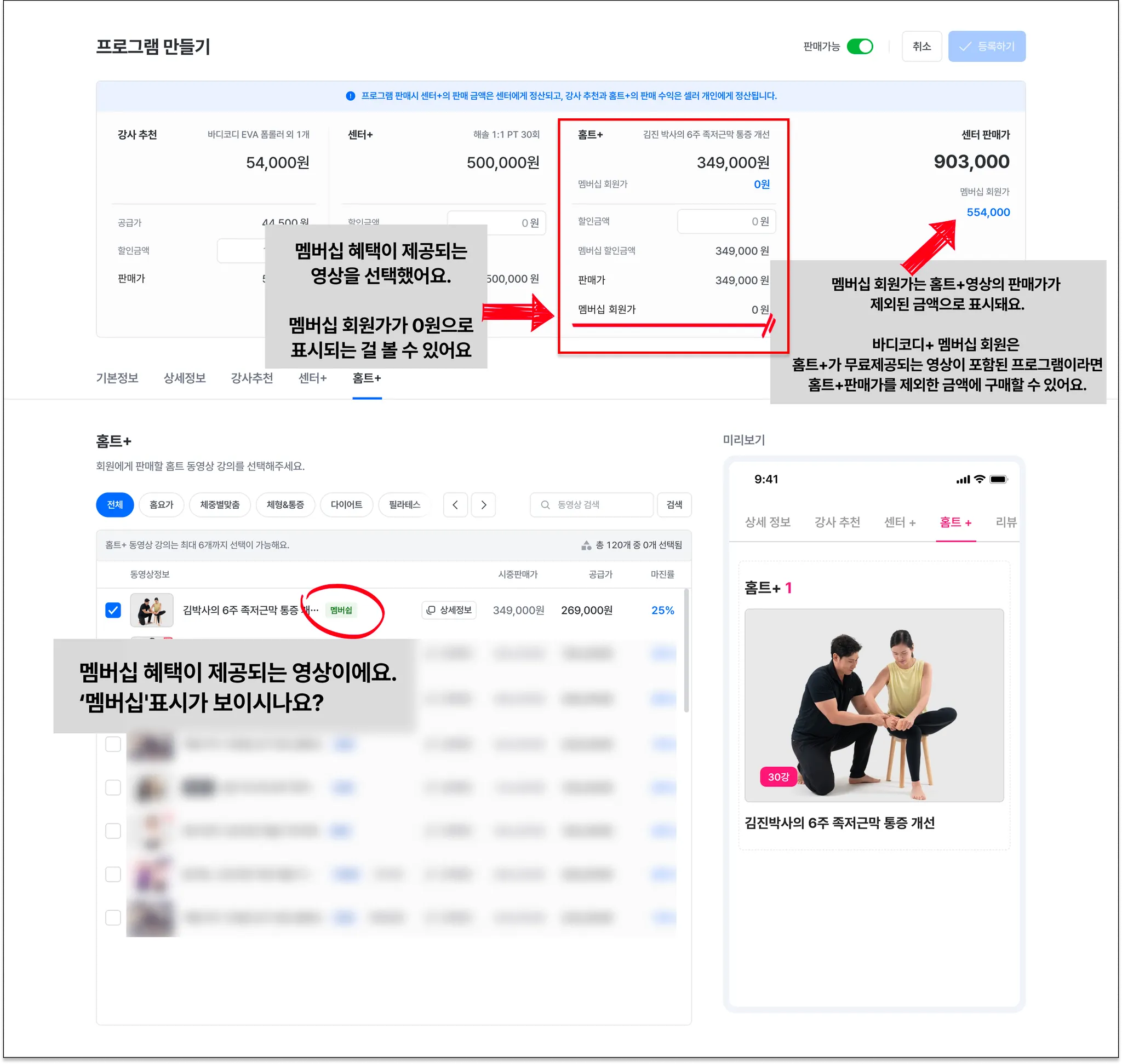 b.pay 이용권으로 판매중인 이용권들과 바디코디에서 엄선한 건강기능 식품 및 보조재, 전문가가 만든 홈트레이닝 영상을 묶어서, 프로그램을 구성하고 판매할 수 있습니다.