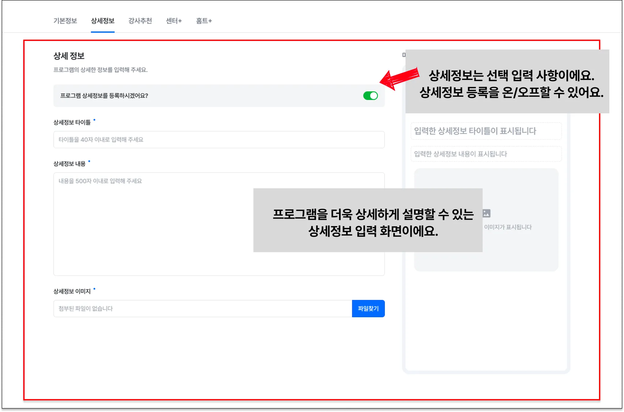 상세정보는 프로그램을 더욱 상세하게 설명할 수 있는 내용을 입력할 수 있는 곳이에요.