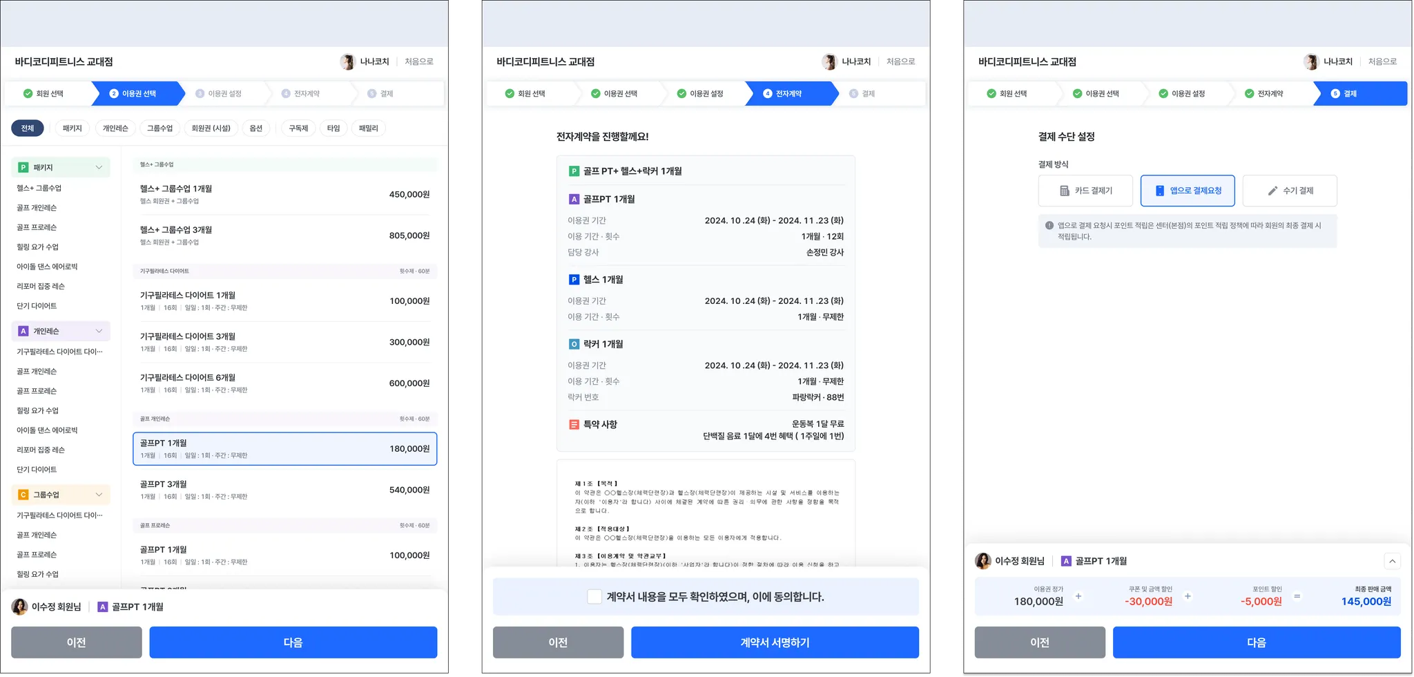 바디코디 태블릿 판매 기능이에요. 계약서 서명은 물론, 앱으로 결제요청도 가능해요.