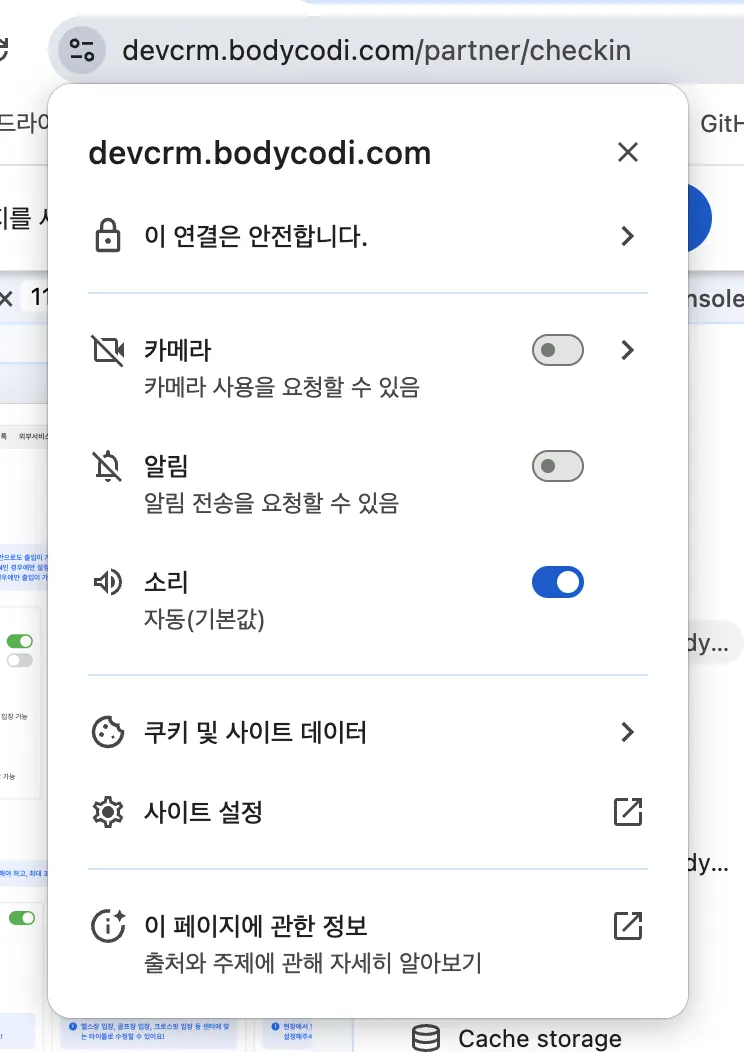 2. 주소창 왼쪽 버튼을 눌러 사이트 설정을 선택해 주세요.