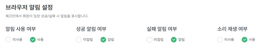 브라우저 알림을 설정해두시면 회원님이 체크인을 통해 입장을 시도했을 때 성공/실패 여부를 확인하실 수 있고, 직원호출 버튼을 통해 도움을 청하실 때에도 알림을 받으실 수 있어요!