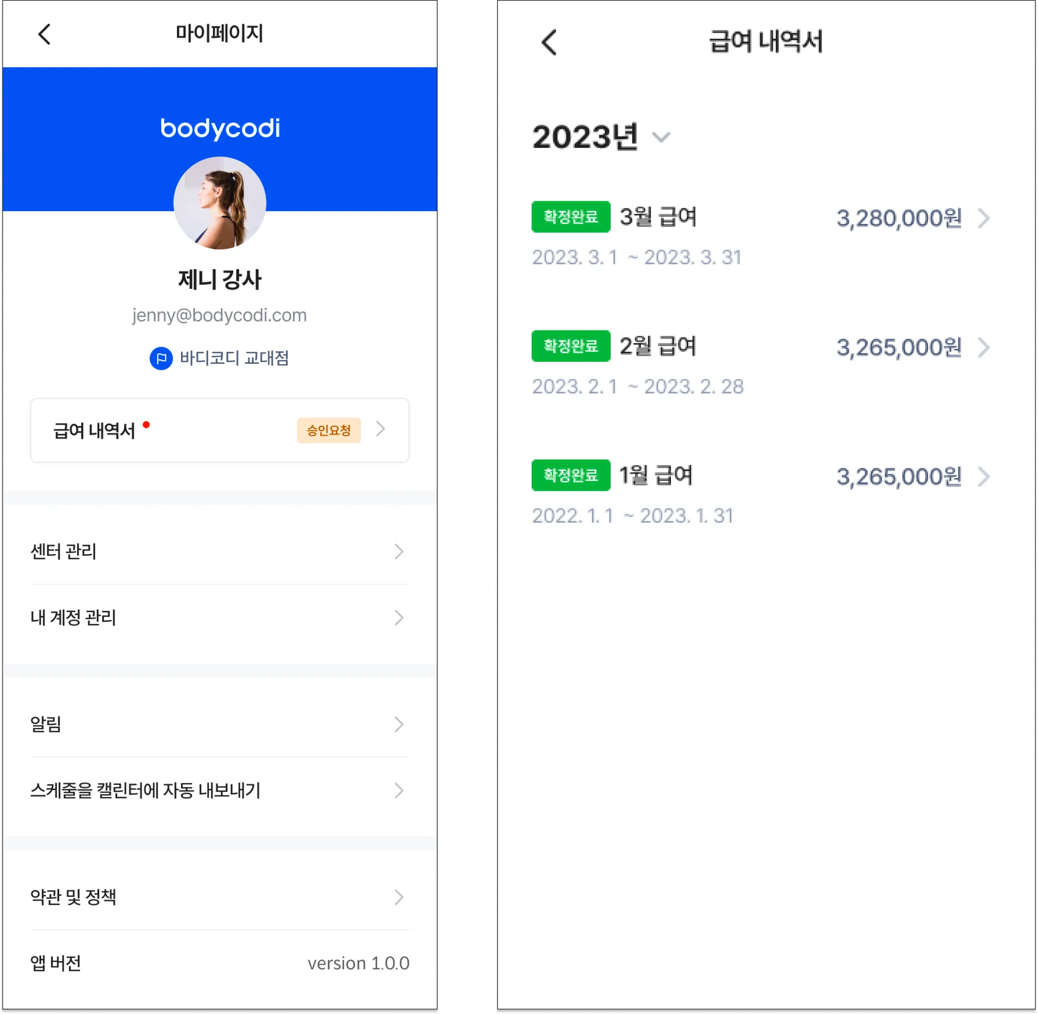 앞으로 바디코디 강사앱에서 급여 내역까지 확인할 수 있을거에요. 기대해주세요!