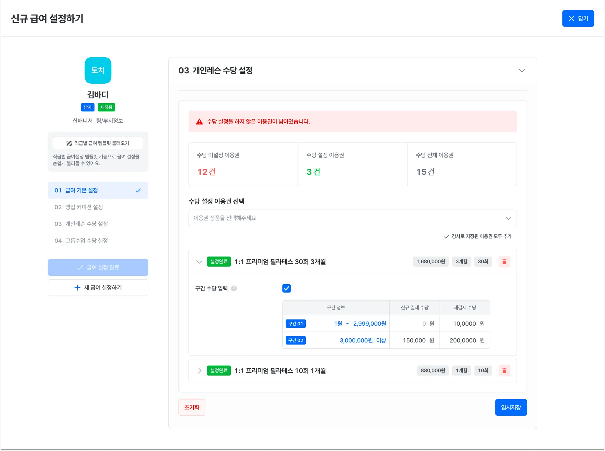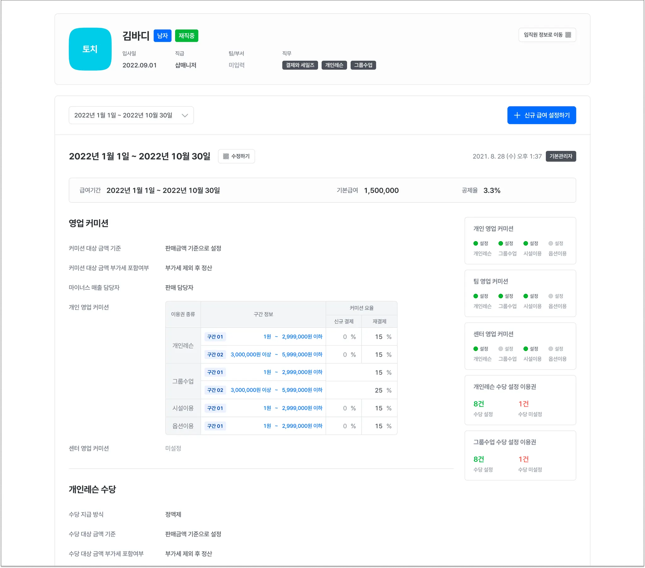 김바디 강사의 급여 설정 화면이에요. 커미션부터 수당까지, 세세한 항목들을 한 눈에 확인할 수 있어요.