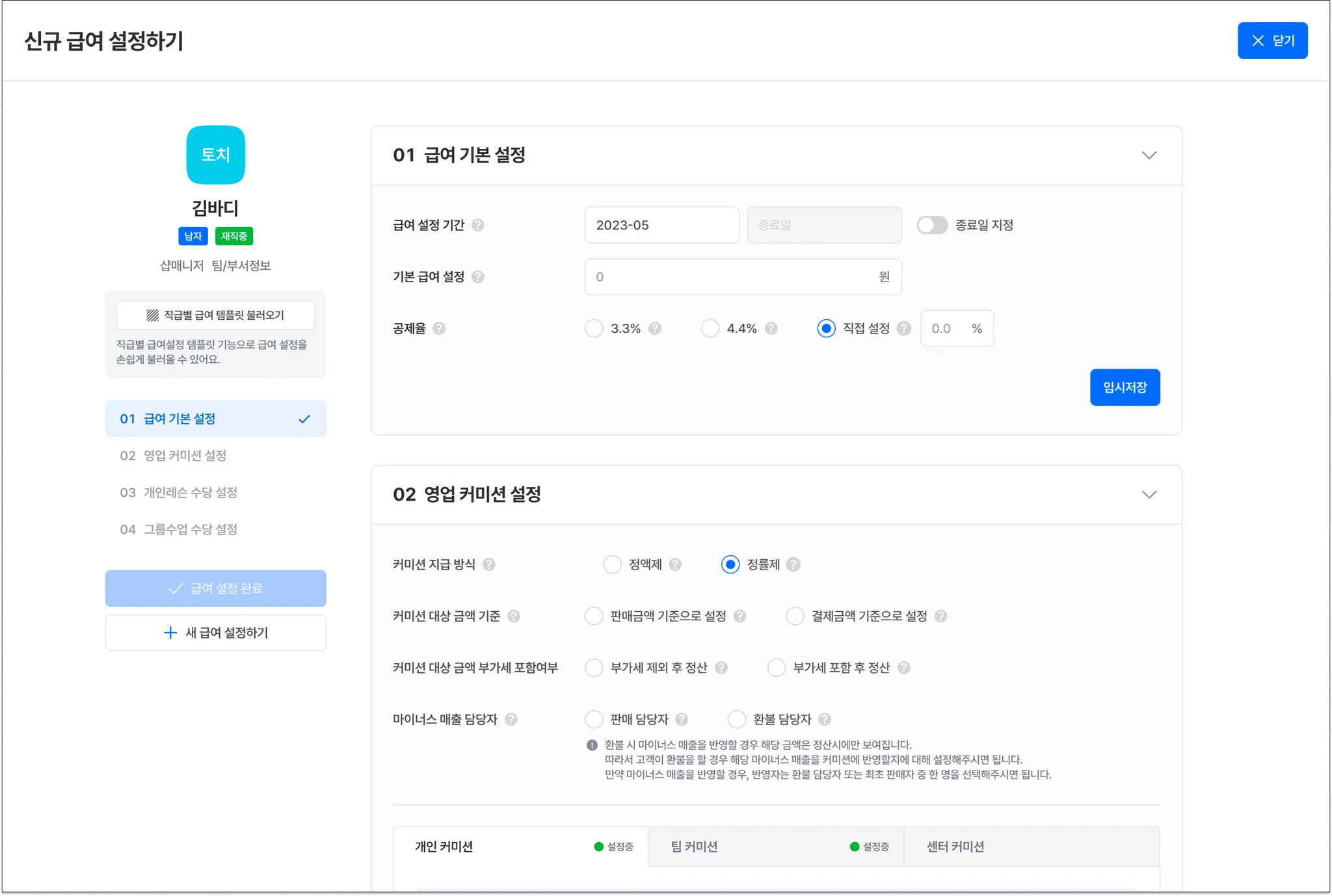 바디코디의 NEW 급여 정산의 설정 화면이에요. 기본 설정부터, 커미션, 수당을 다양한 정책에 맞춰 설정할 수 있어요.