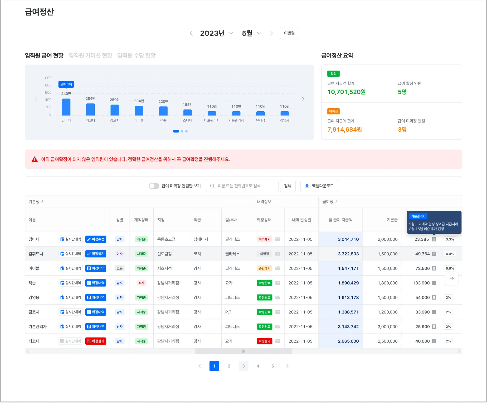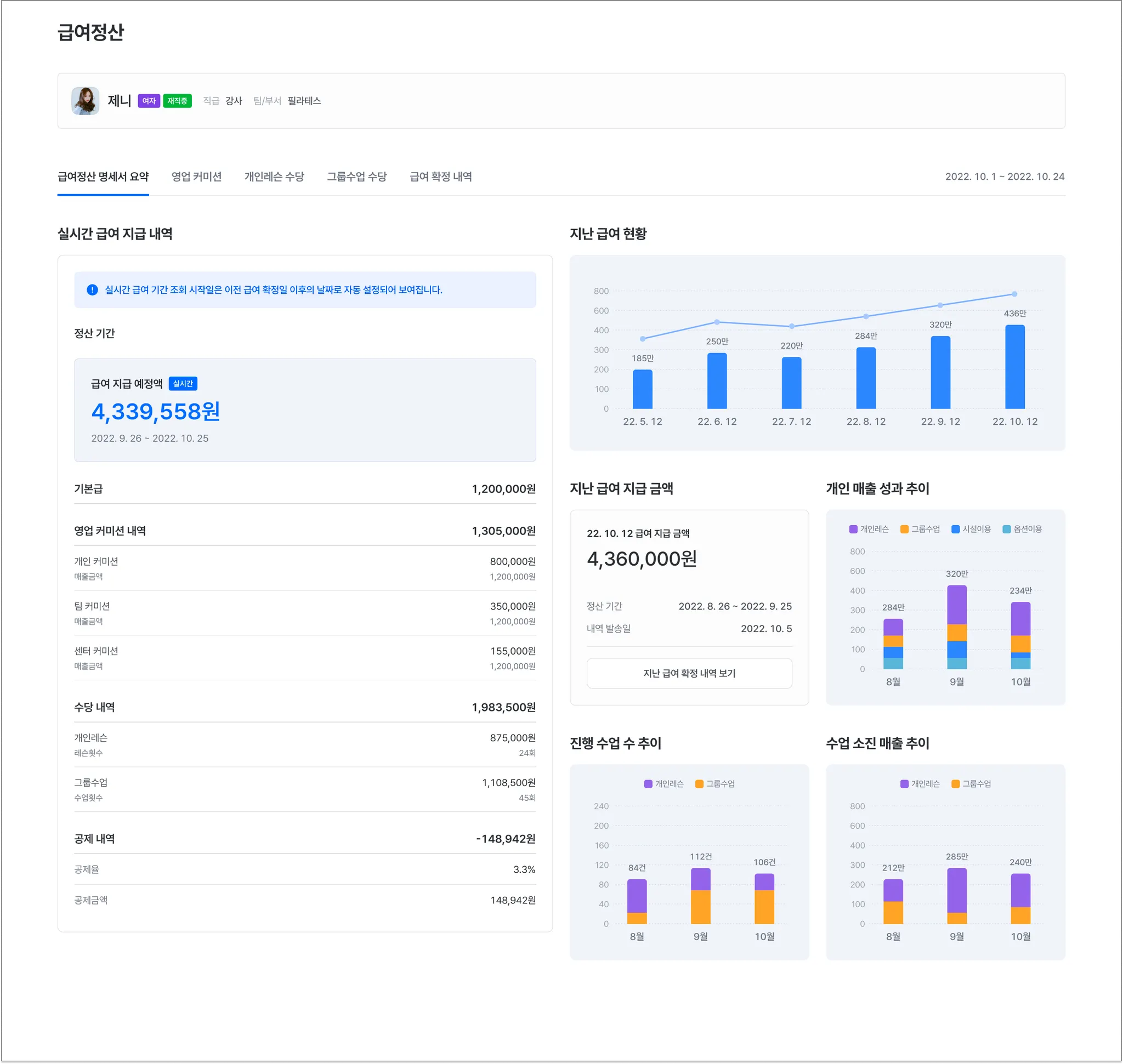 지급한 급여의 추세와, 현재 성과를 확인할 수 있고 상세한 내역까지 확인할 수 있어요.