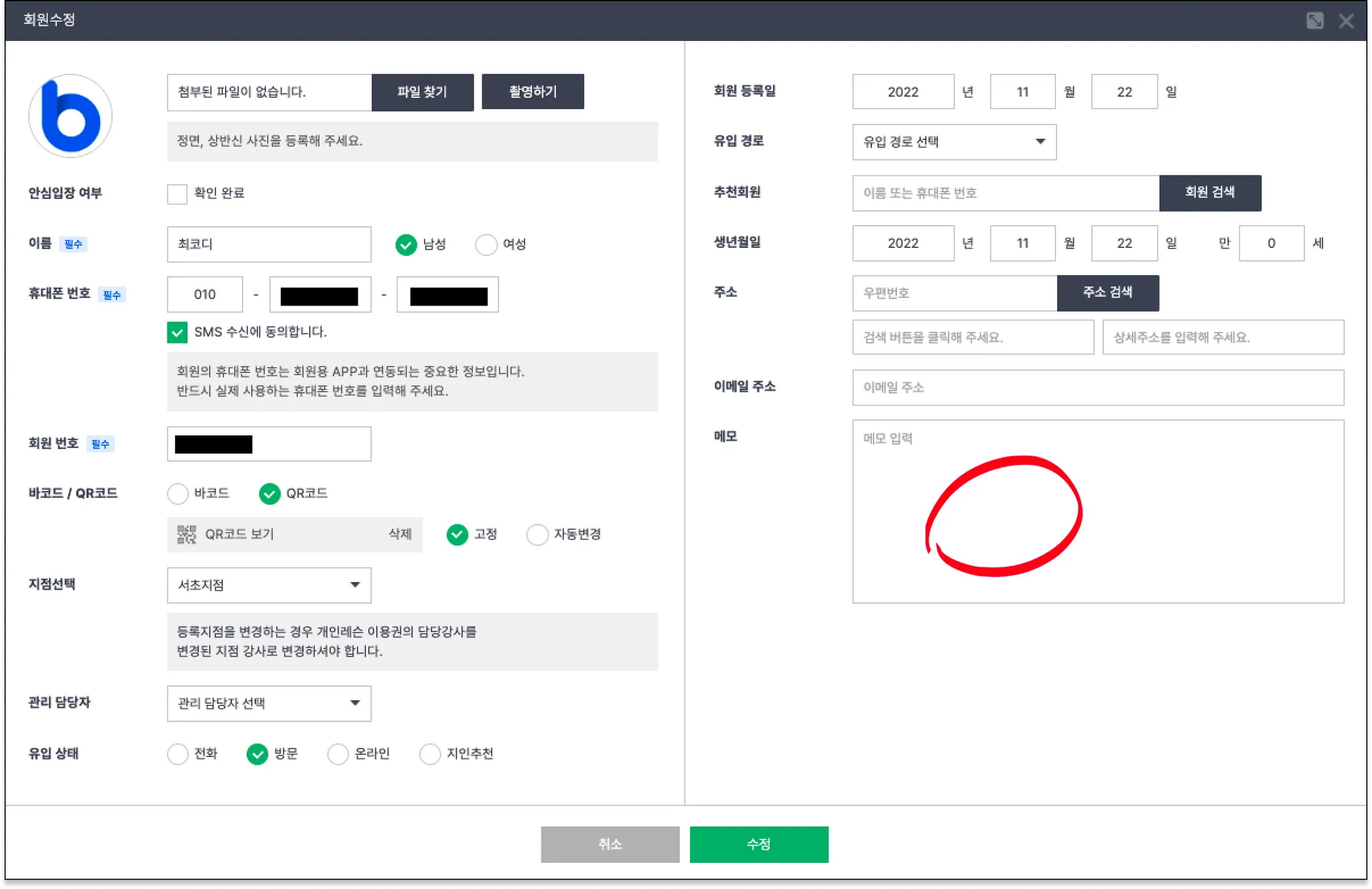 회원 상세 > 회원 정보 수정에 접속 후 입력할 수 있는 메모