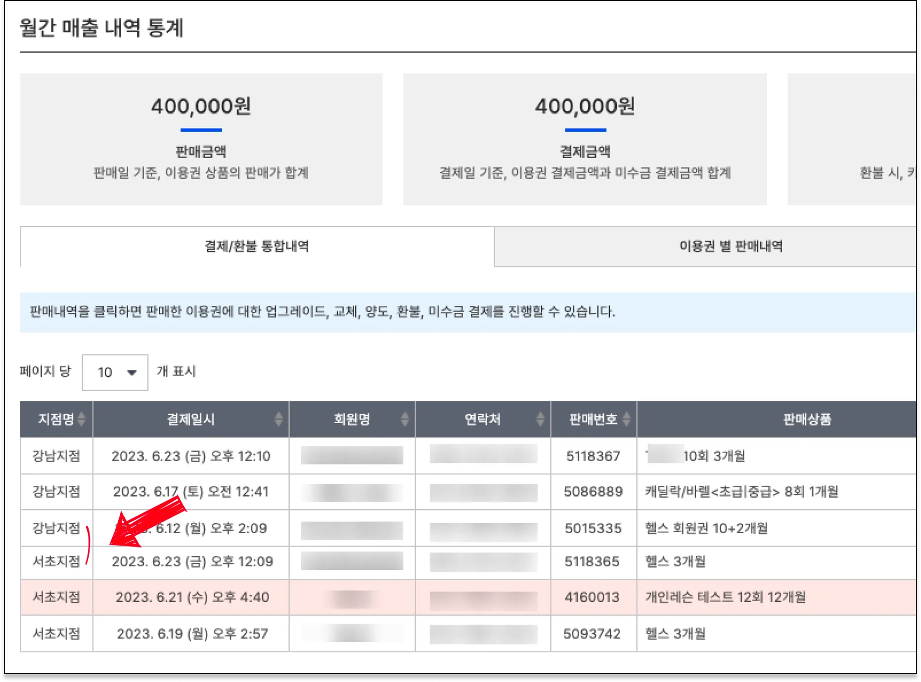 지점 계정으로 접속 후 이용권 매출조회 시 다른 지점의 매출 내역이 함께 조회되어 판매금액이 잘못 계산되는 현상을 발견했어요.