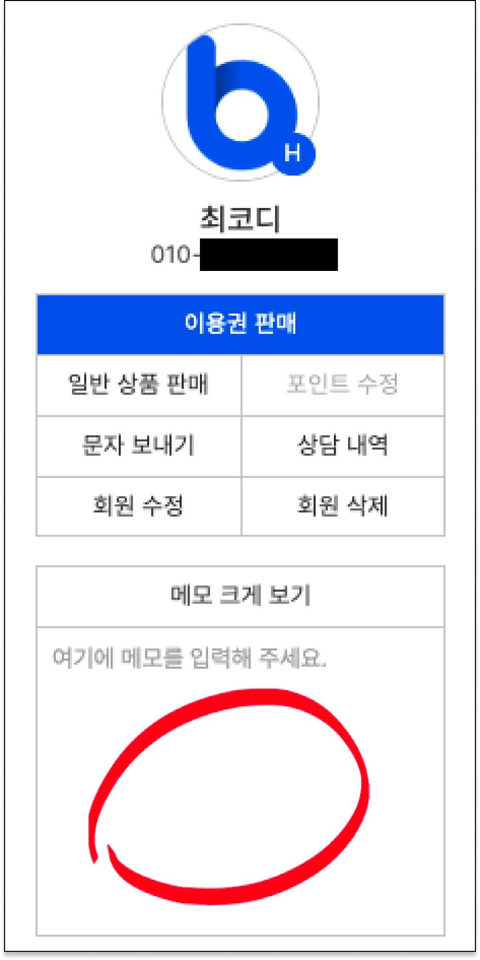 지점통합형의 경우, 회원은 동일하지만 지점 별로 회원은 따로 관리하기 때문에 지점에서 입력하는 ‘메모’가 굉장히 중요해요.